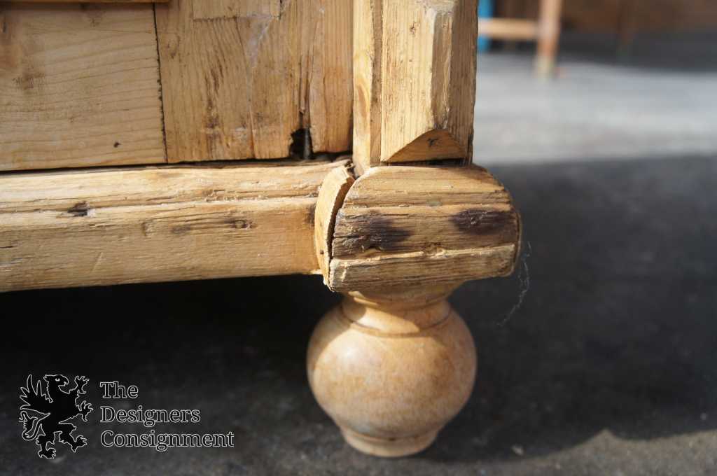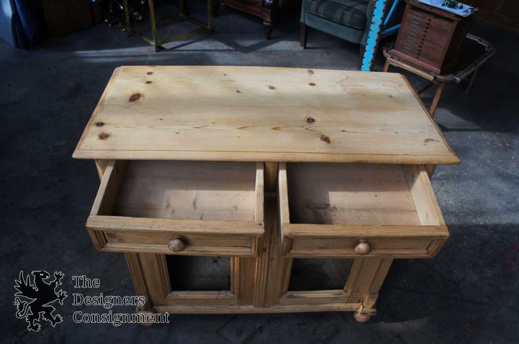 A beautiful late 19th century English cabinet. Made from pine with a bleached finish. Neoclassical style with 2 drawers over lower cabinet with shelf. Supported by four bun feet. Features chicken wire cabinet doors for an open feel. The outside of the cabinet front has elegantly grooved fluting over scrolled corbels with carved flourish. Upper drawers are hand dovetailed. The perfect compliment to any setting.