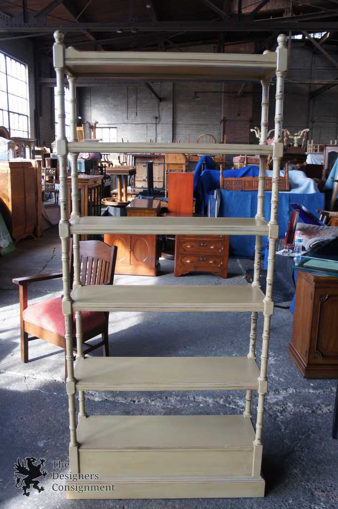 Ethan Allen Georgian Court Collection Etagere. Perfect for display of books and collectibles. Traditionally styled faux bamboo columns and lower shelf with drawer. Made from Solid Cherry with selected veneer. This cabinet has been painted in a white with slight grayish tint allowing for the original cherry to still be seen in places. A neat compliment to any setting.