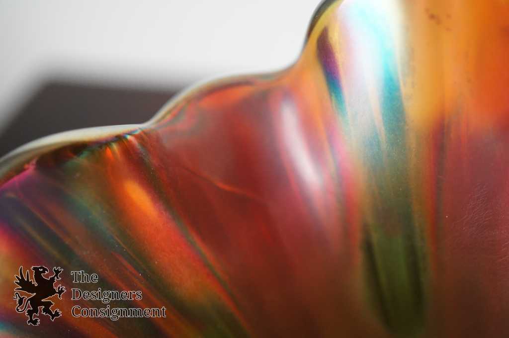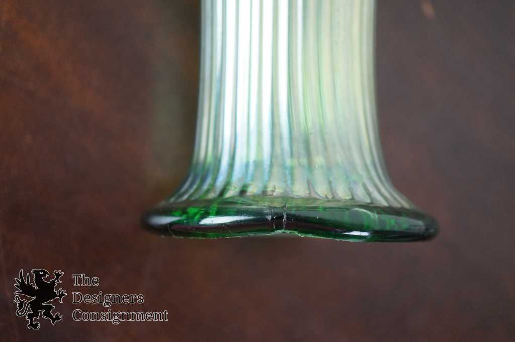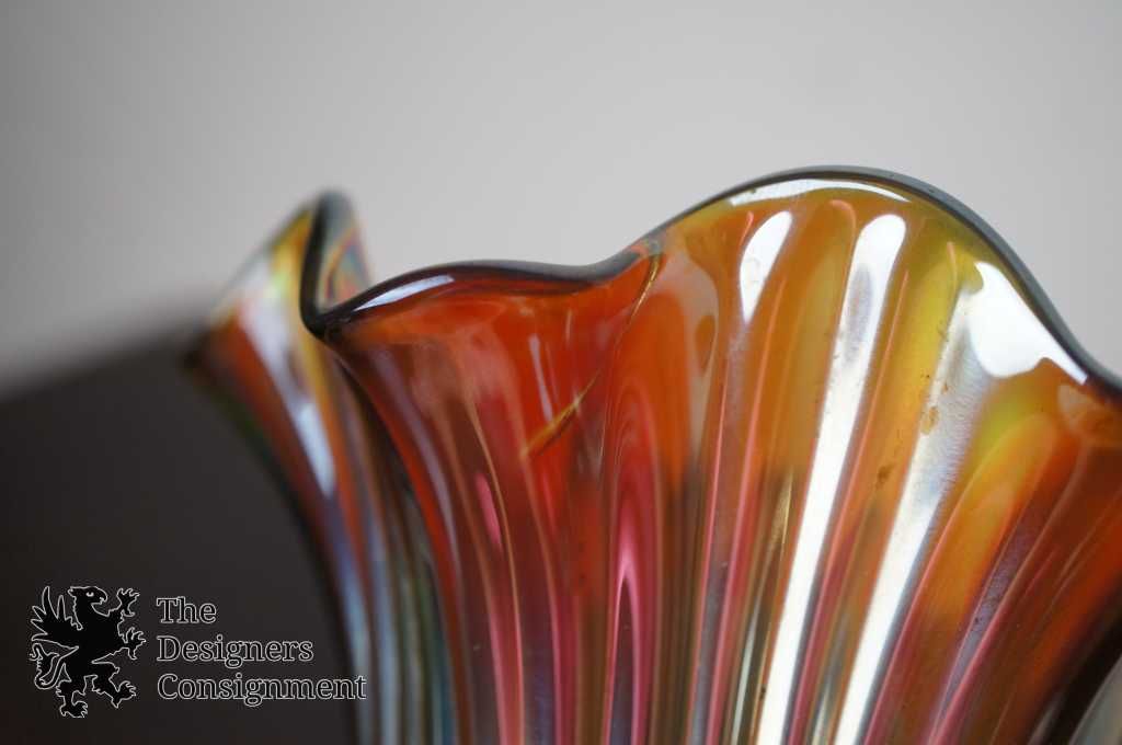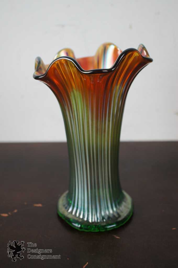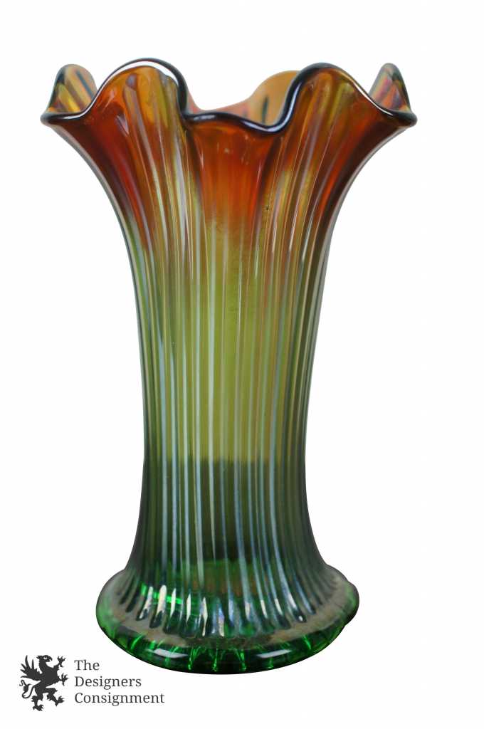 (Crack in Lip) Antique Green & Orange Depression Carnival Glass Flower Vase Ruffled Iridescent