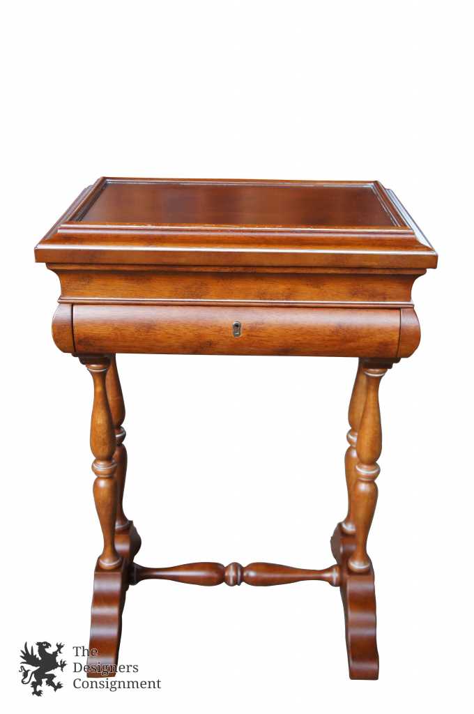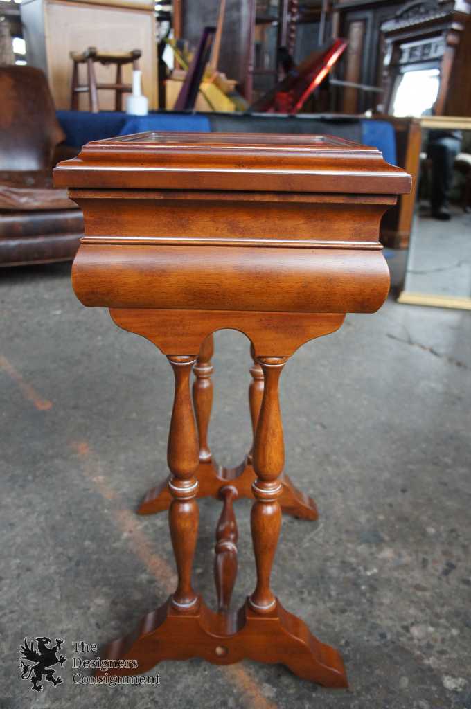 Early American style flip top jewelry cabinet by Bombay Co. Finished in Mahogany with felt lined drawers and embroidered lid. A sleek design that will look great in any setting