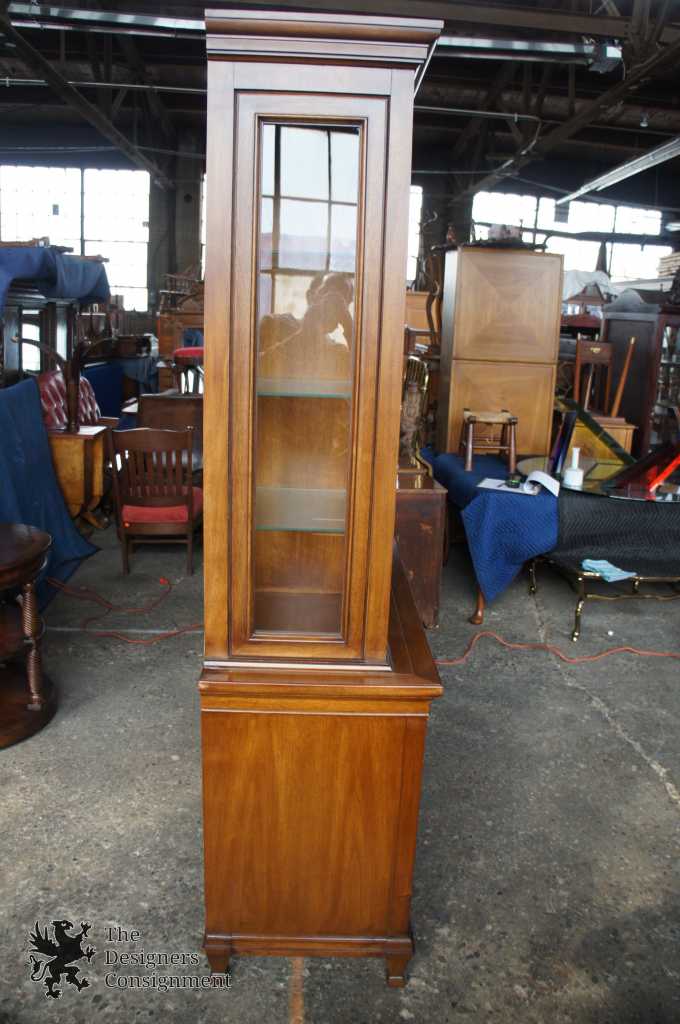 Up for consideration is a gorgeous buffet and china hutch by White Furniture Company. Made from walnut with a stepback design featuring a glass front and carved accents. Features 3 dovetailed drawers flanked by outer cabinets. Hutch is illuminated with glass shelves and plate grooves. Matching server available separately.