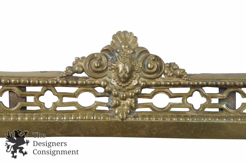 Brass Figural Fireplace Fender Insert. Late 19th century with figural design showing female at the center with headress. The insert features fretwork mounted between gadrooning. The perfect compliment to any setting.