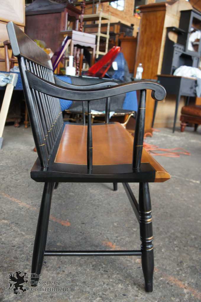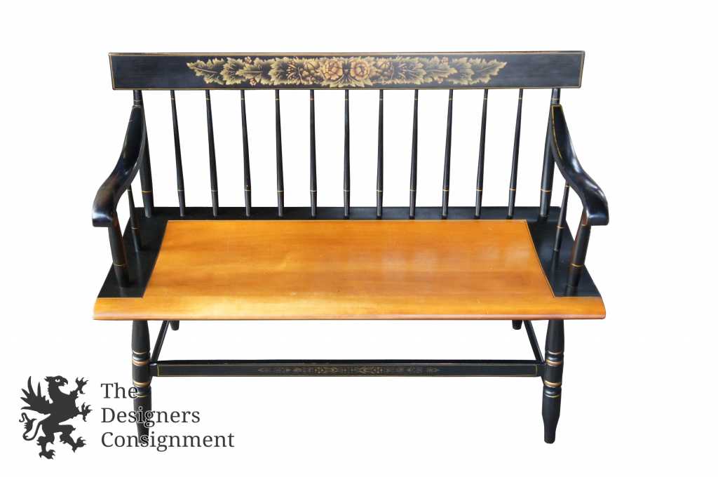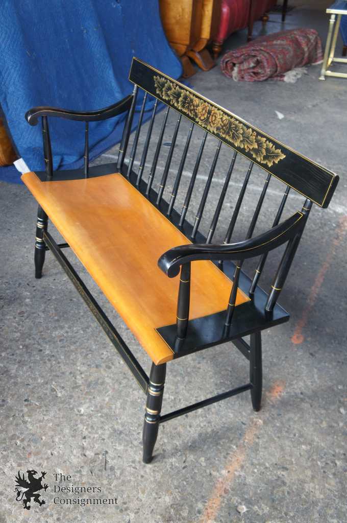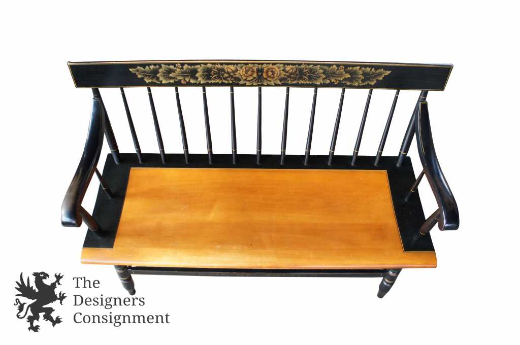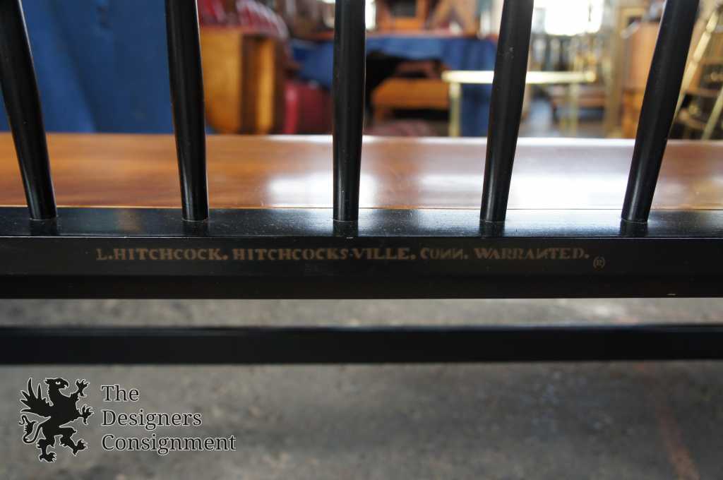 L. Hitchcock Black Harvest Maple Bench. Windsor style with stenciled back and lower stretchers. Features beautiful turned spindles trimmed in gold. A neat addition to any collection.