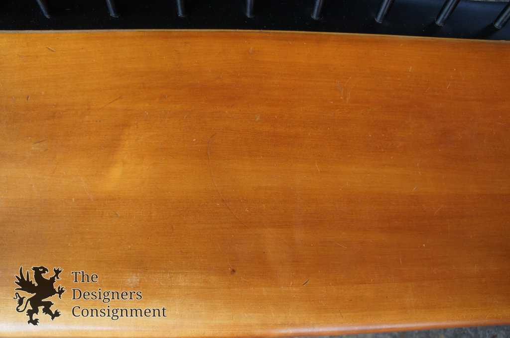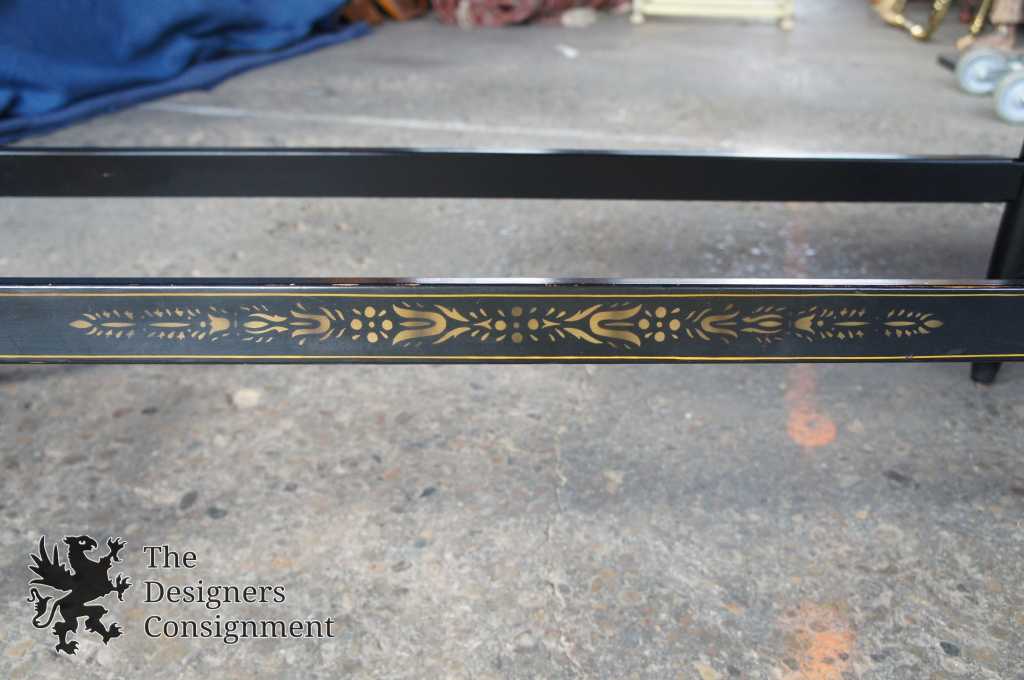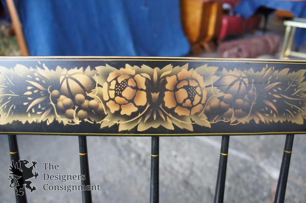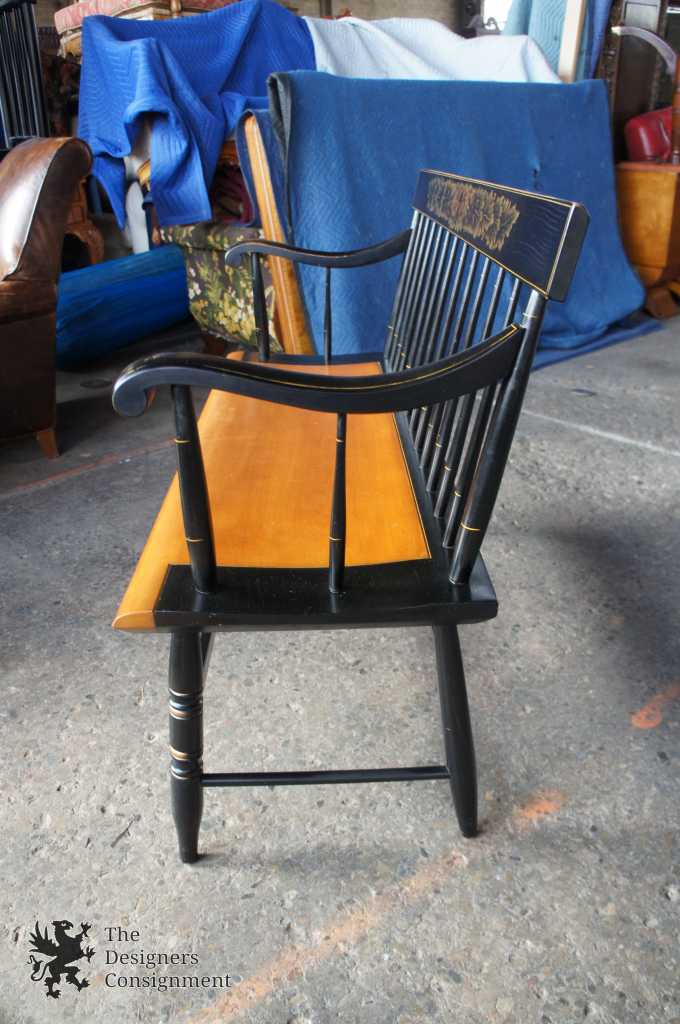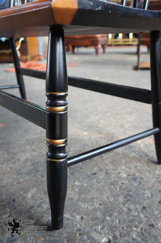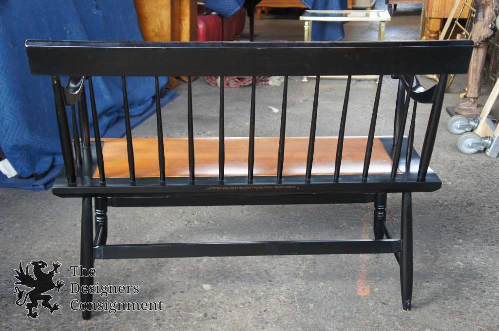 L. Hitchcock Black Harvest Maple Bench. Windsor style with stenciled back and lower stretchers. Features beautiful turned spindles trimmed in gold. A neat addition to any collection.