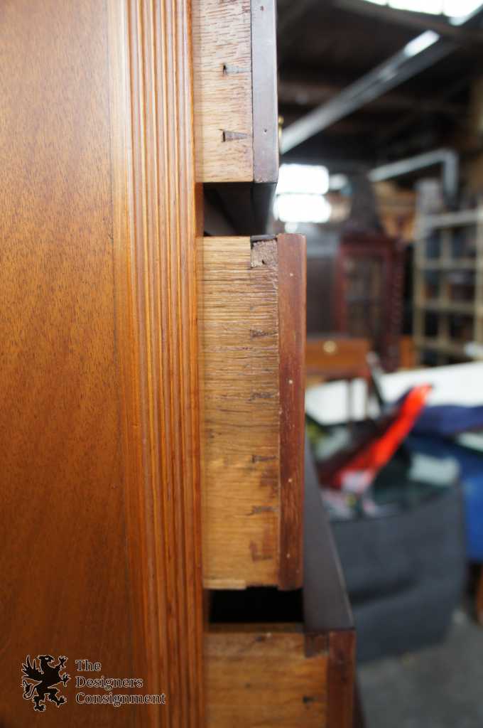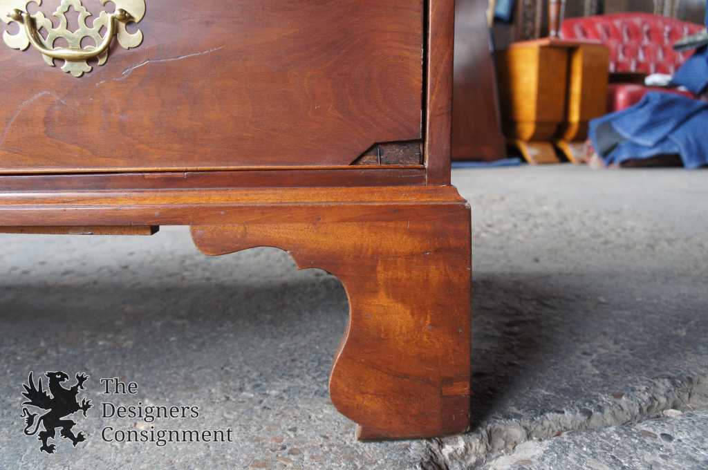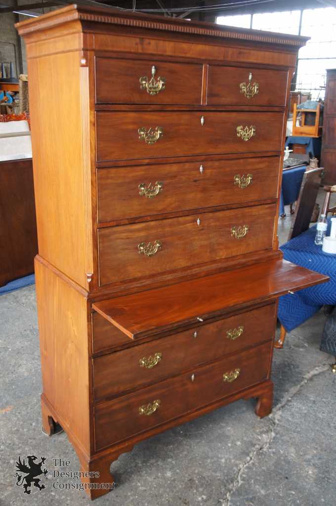 C. 18th Century English Mahogany Chippendale Chest on Chest. Exceptionally designed with 8 hand dovetailed drawers featuring brass pulls and unique hideaway acorn keyholes. Includes a notched crown, fluted corners, pull-out shelf and bracketed feet.
