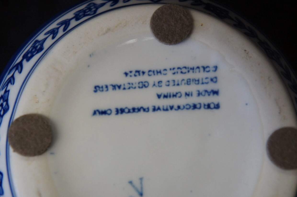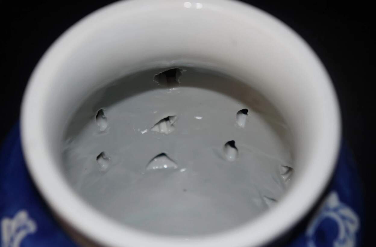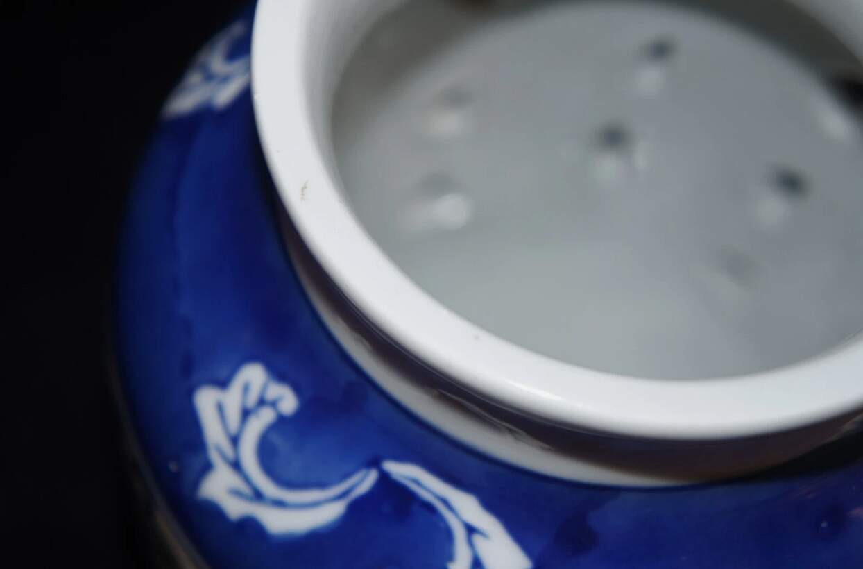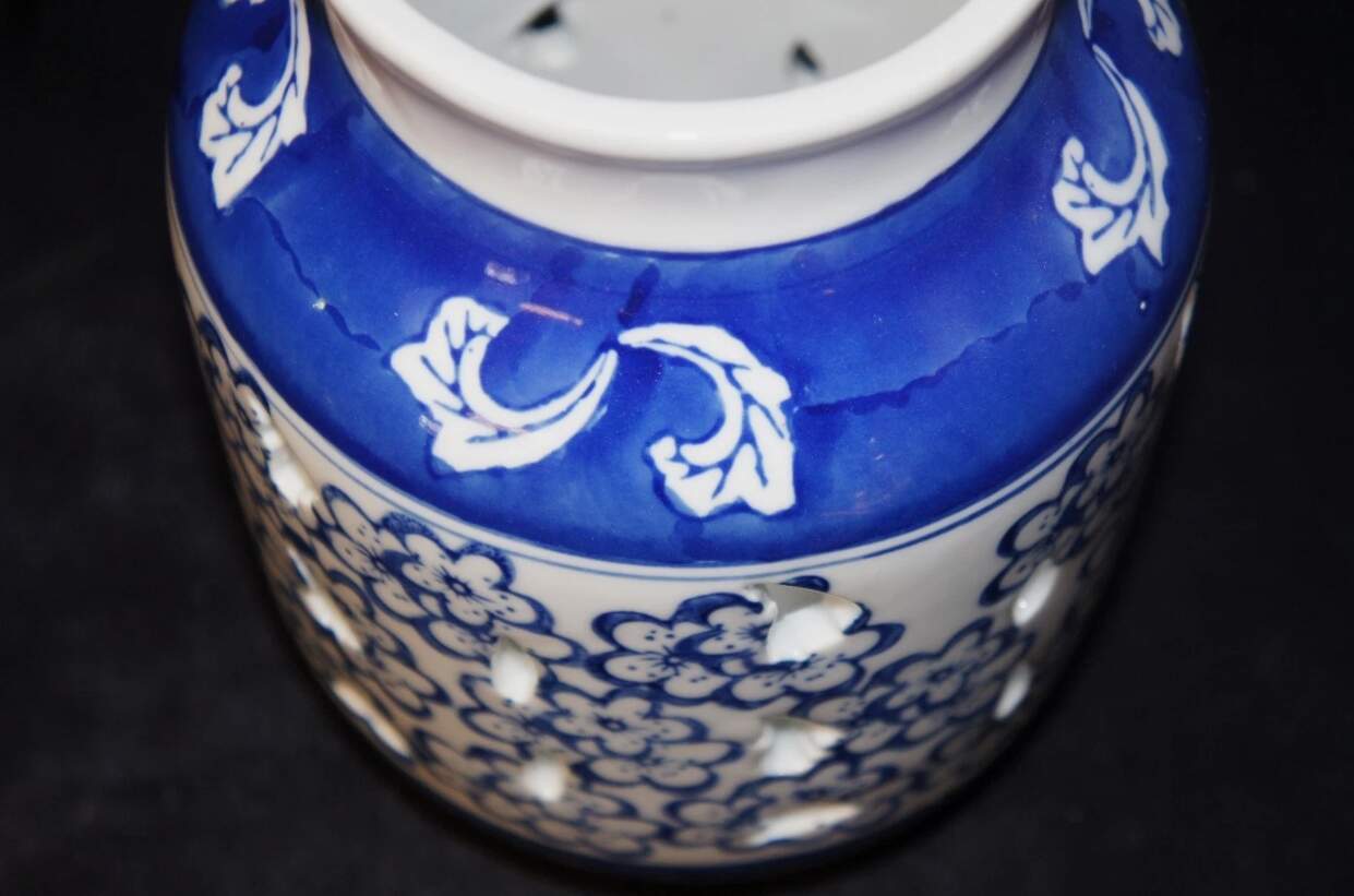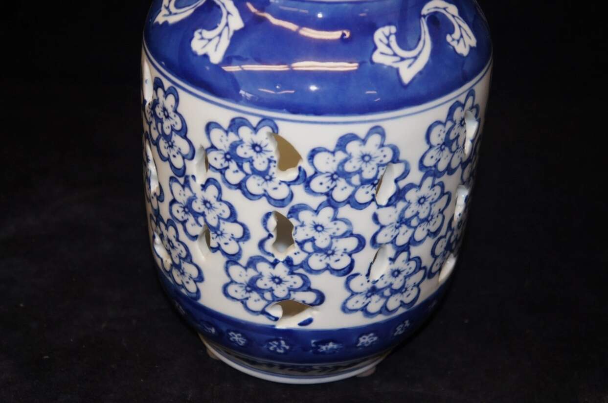 This is a gorgeous piece of fine porcelain. It is a reticulated porcelain vase and it is decorated with floral designs and it has a lovely blue and white color. This is an absolutely beautiful piece and it would make a wonderful addition to your home or collection.