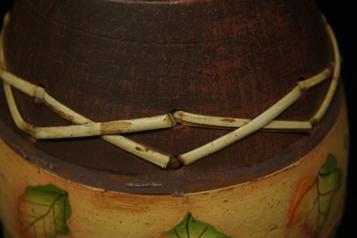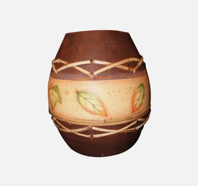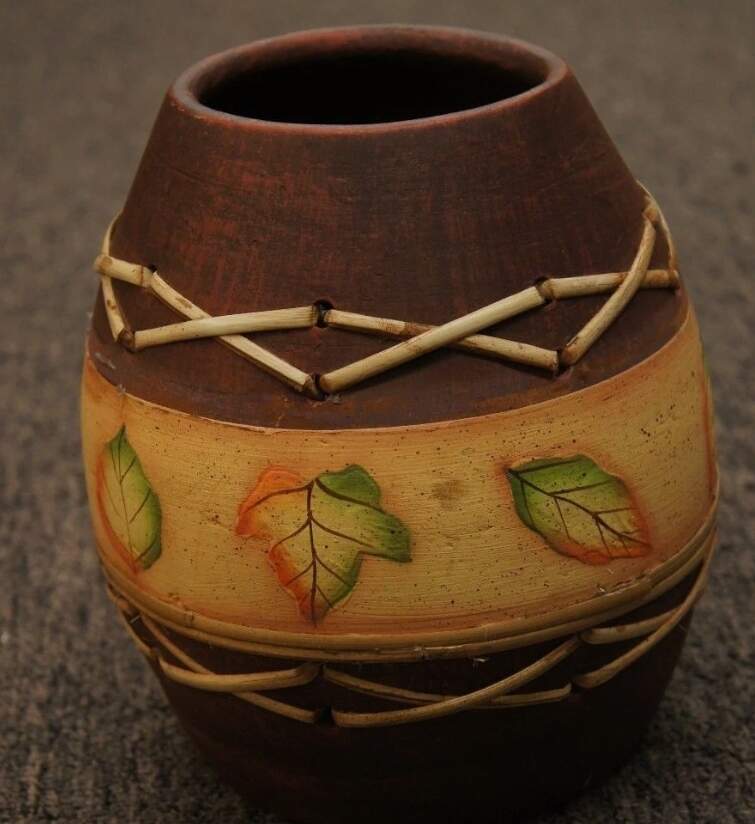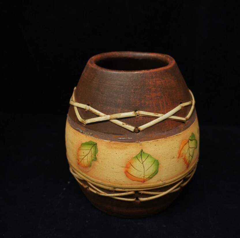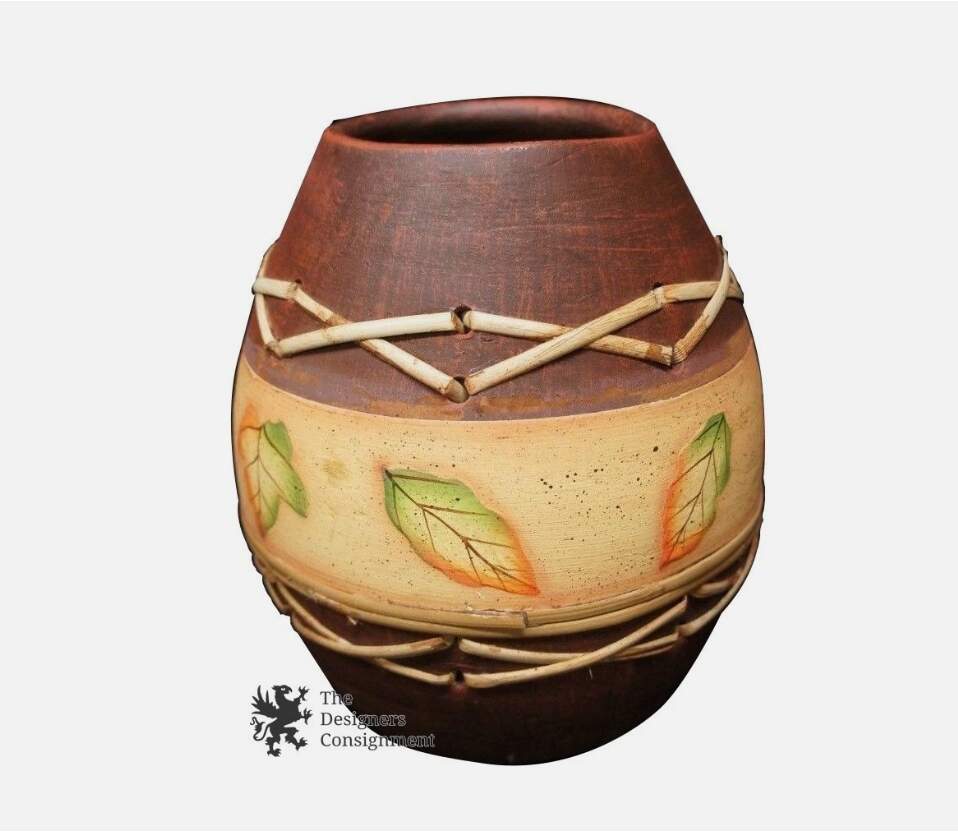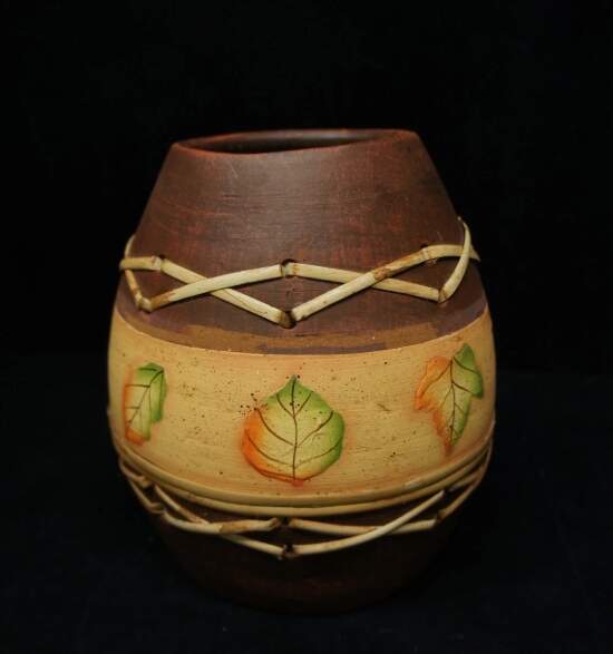 Here is a fine hand thrown earthenware vase. Features woven bamboo accents and hand painted leaves. Will make a wonderful addition to any home or a great gift!