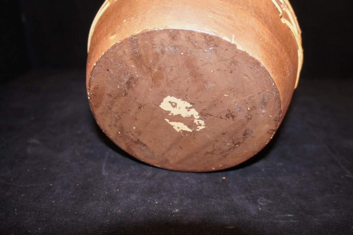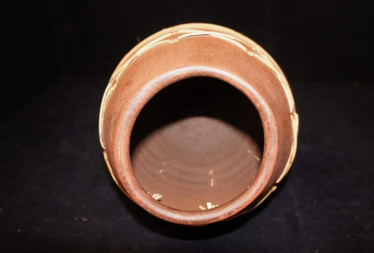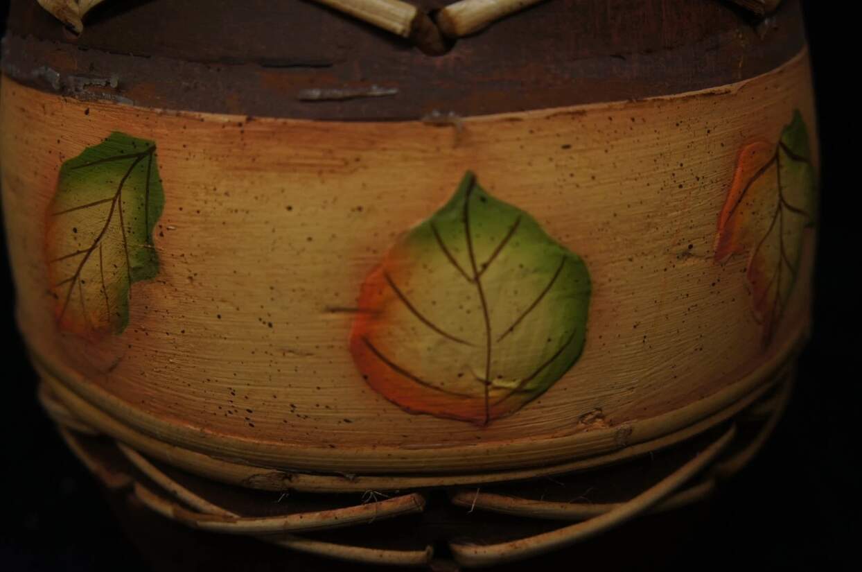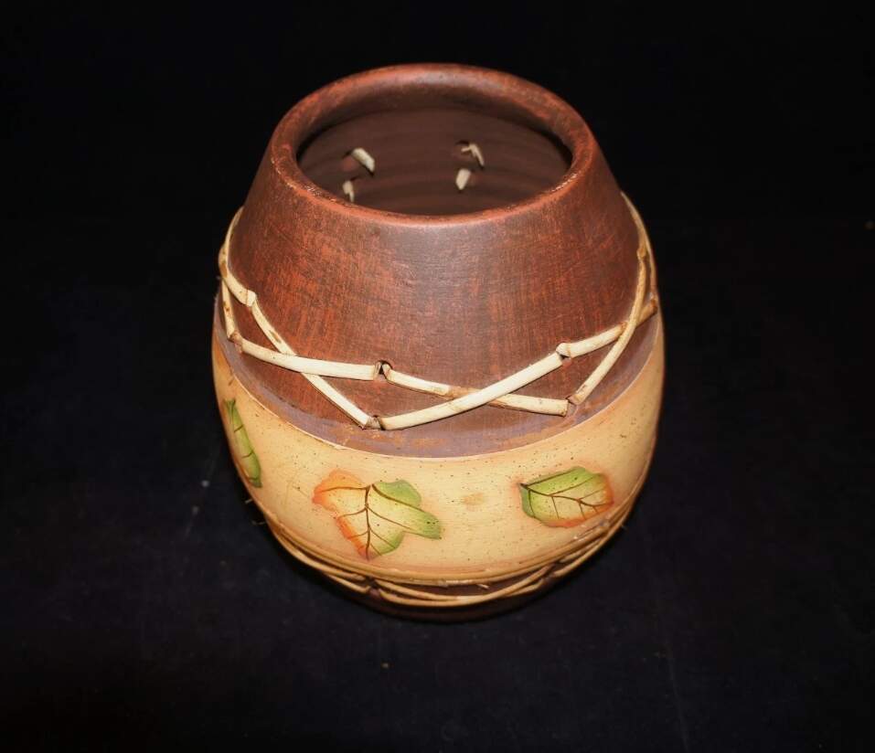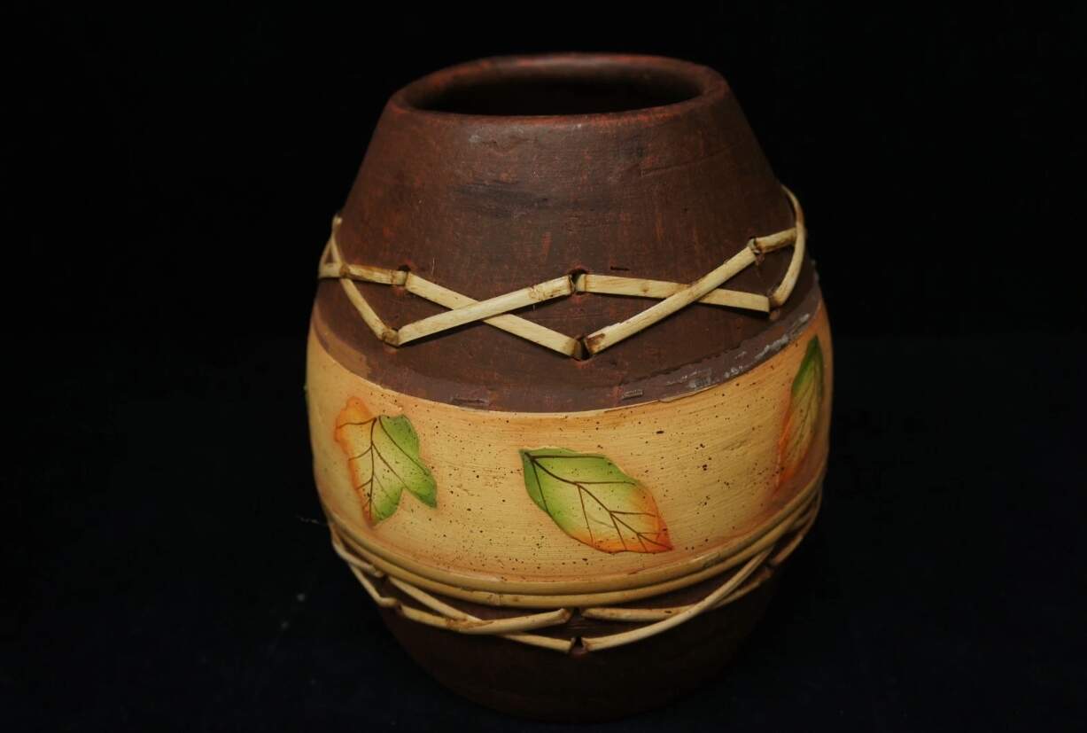 Here is a fine hand thrown earthenware vase. Features woven bamboo accents and hand painted leaves. Will make a wonderful addition to any home or a great gift!