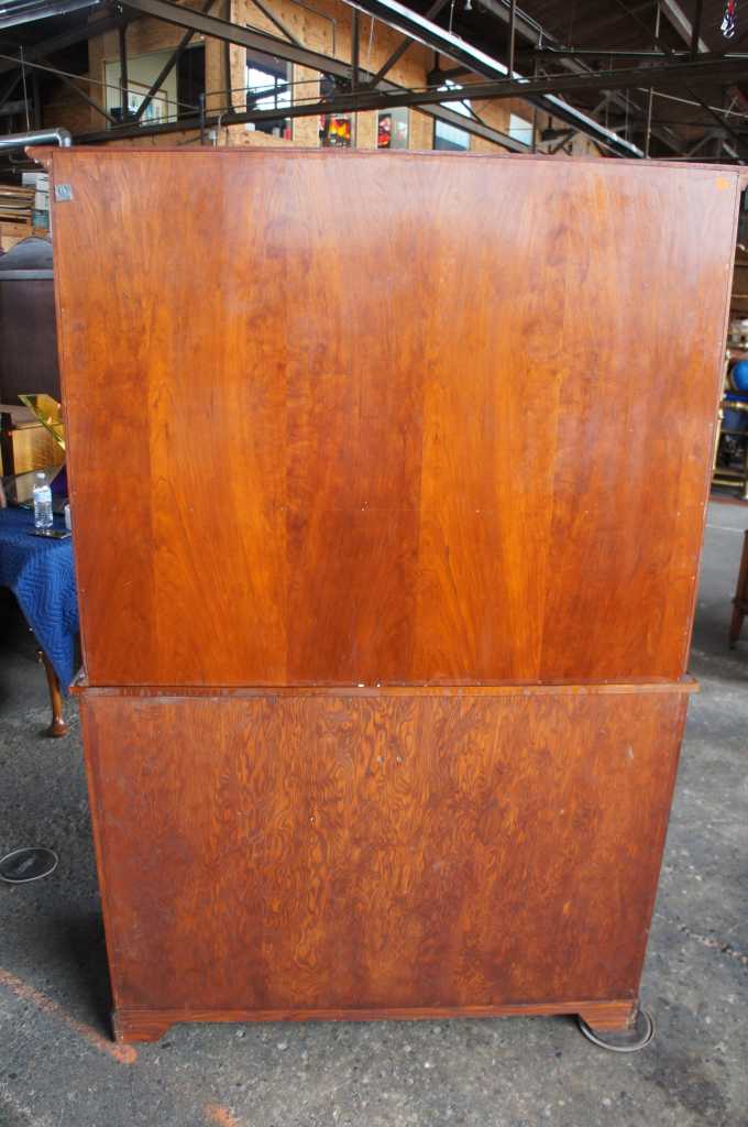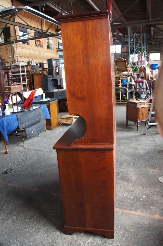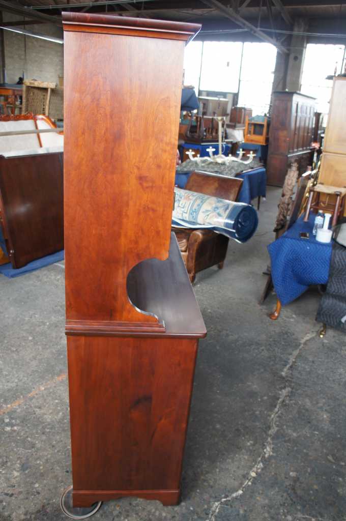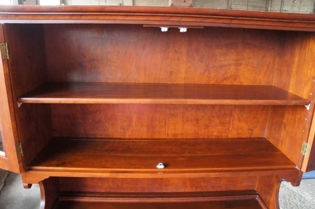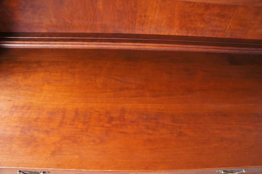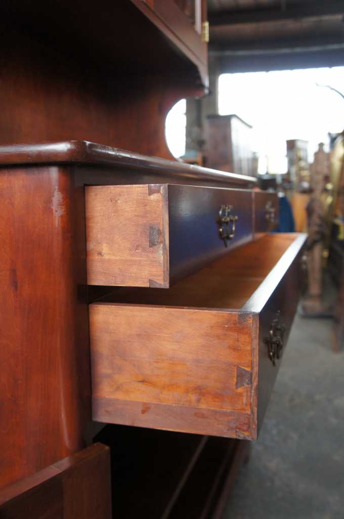 Exceptional Amish made cherry cupboard. Early American in style with a glass front and brass hardware. The base has 3 dovetailed drawers along the top and lower cabinet with shelf for storage. Hutch features a plate groove along the very back of the main surface in addition to a glass front display with shelf. A neat addition to any setting.