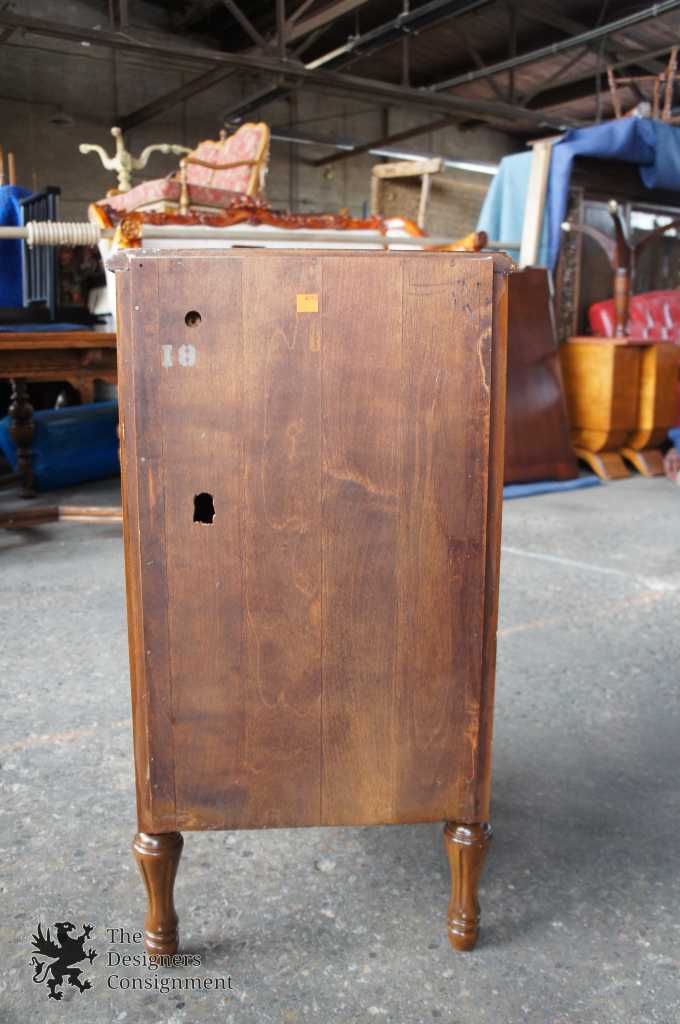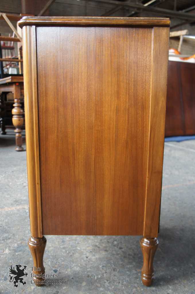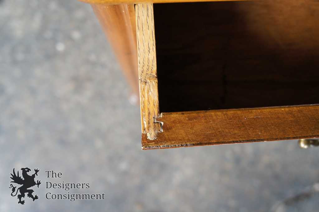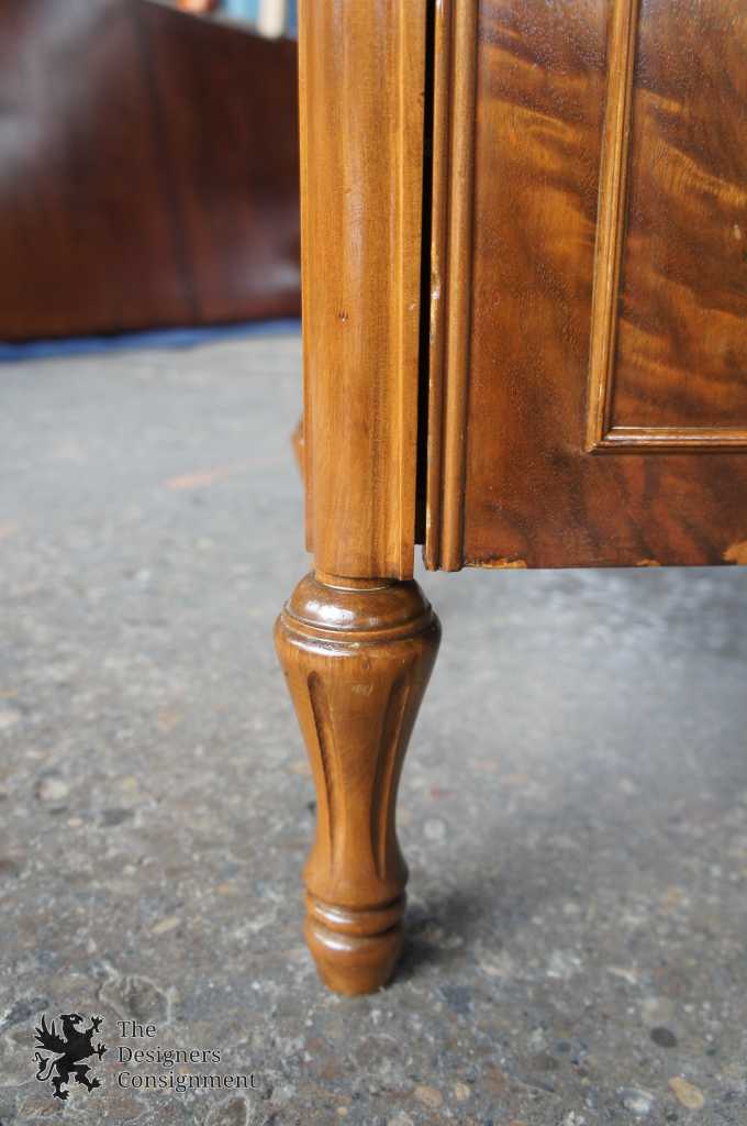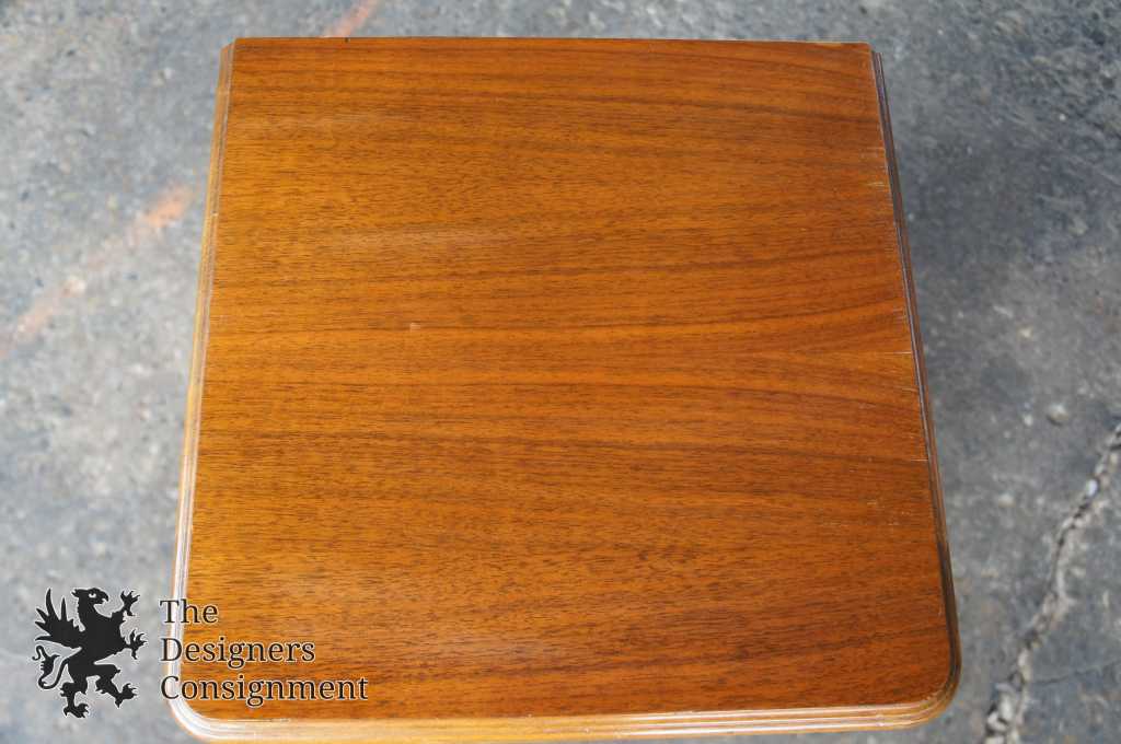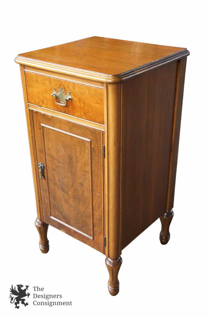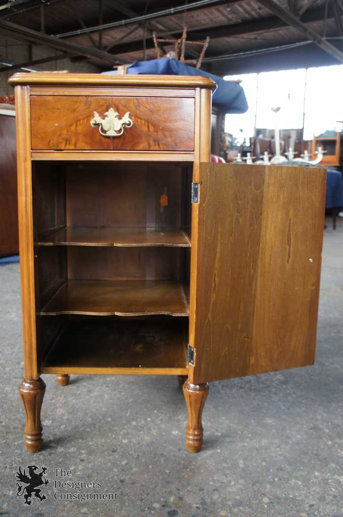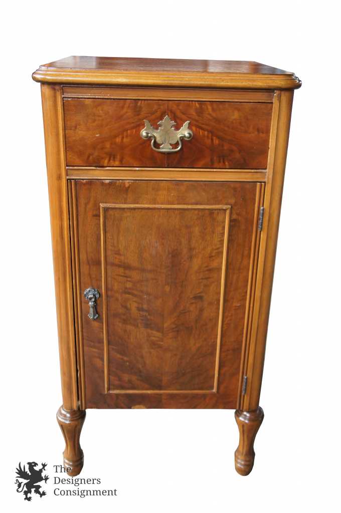 C.1930s Art Deco End Table. Made from Walnut with a crotch walnut veneer front and brass hardware. Features tapered and fluted legs in addition to two serpentine shelves on the interior.