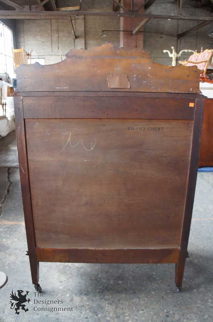 Circa 1930s Art Deco Dresser. Made from crotch walnut with intricately carved details. Features 5 drawers and 3 glove boxes. Legs are turned on castors. Paper Label along the back marked Victor Furniture Co Dayton, Ohio