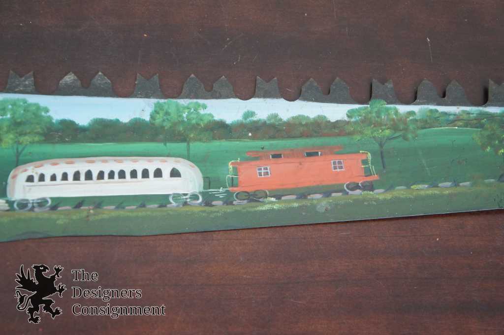 A beautifully hand-painted two man crosscut saw. Features a train scene along one side and a farm scene on the other. Hand signed by Ross 1976. The perfect conversation piece for any home