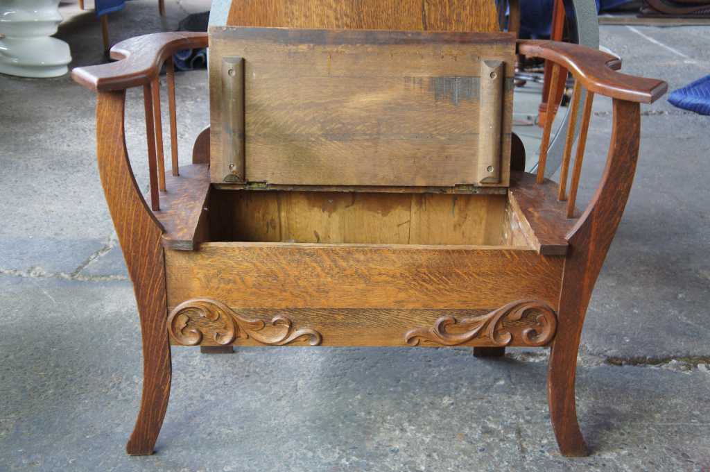 Exquisite turn of the century wide-body hall tree. Made from Quartersawn Oak. Features a beveled glass panel, ornate thick hanging iron hooks, and ornately carved trim. The bench seat lifts up for added storage. The perfect piece for any entryway.