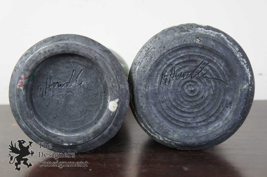 A gorgeous pair of Raku sighned vases. Each vase has a black body with long green leaves and flowers along the top. Amazing color and detail! Perfect for use or display