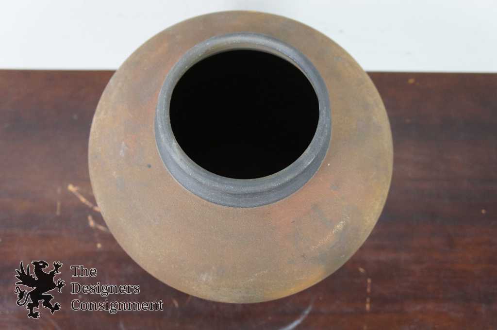Raku Pottery Jar or Vase. Beautifully detailed with purples and greens. Lid features a unique figural deisgn. Signed along the bottom 1983. We cannot discern the artists name