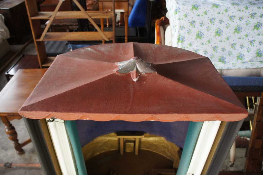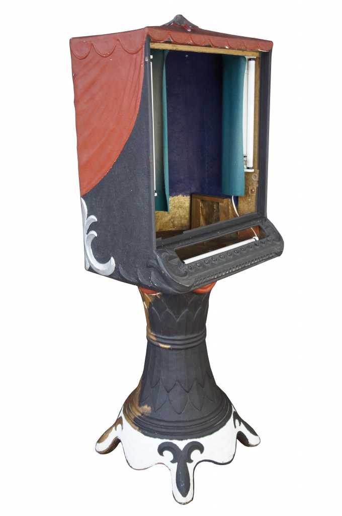 Originally an Upright Machine that has since been gutted. The fortune teller (Zoltan) is missing, as well as to the cabinet face and electronics. The body was also painted, yet some of the original gold paint can still be seen. Made from fiberglass. Approximately 50 manufactured.