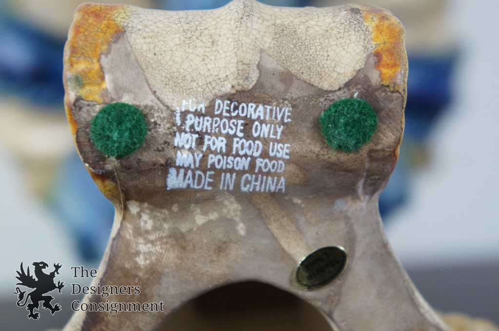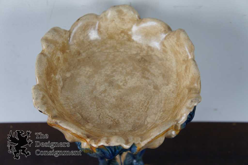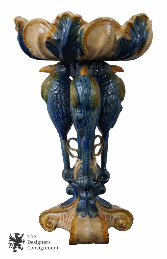Amphora-Style Pottery Figural Compote: The piece is stylized with a scalloped leaf form bowl, being supported by three plumed birds on a tri-foot scrolled protruding base. The piece is glazed in hues of Tan, yellow,green and blue