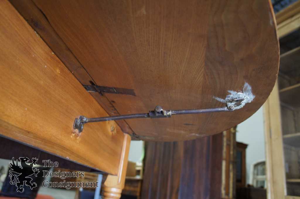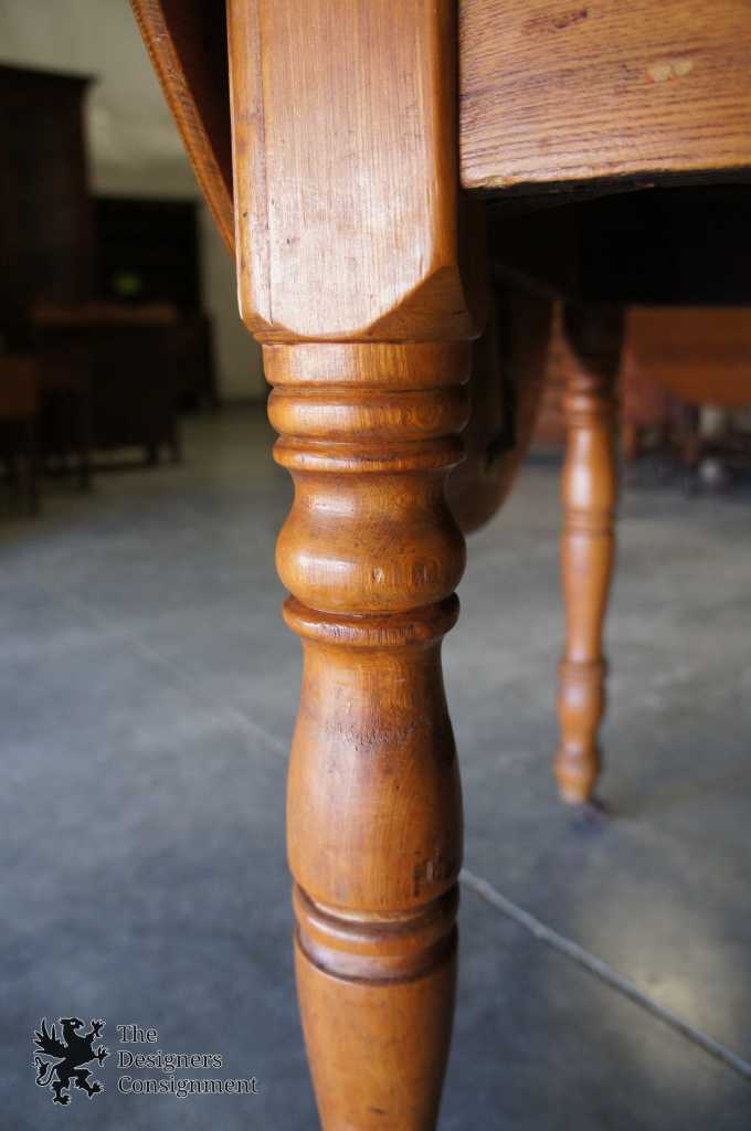 Late 1900s drop leaf table. Made from oak with beautifully turned legs over casters. This table has great action along the drop leaf support that is released by pulling out the pin at the center of the rod.