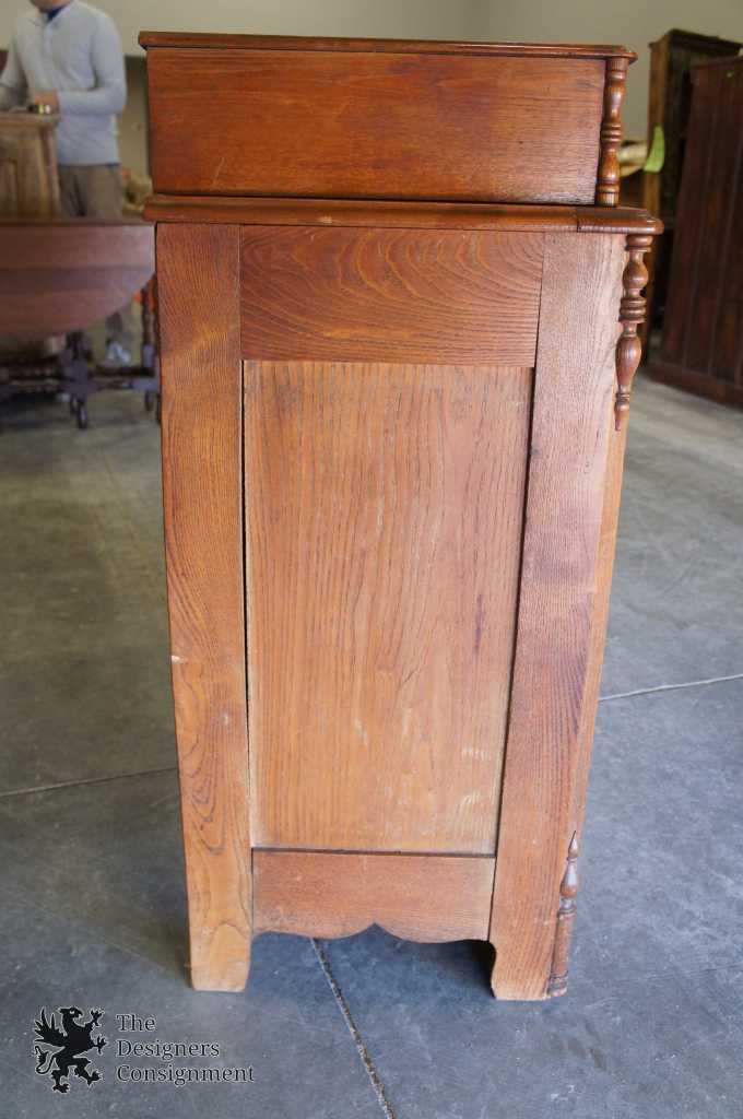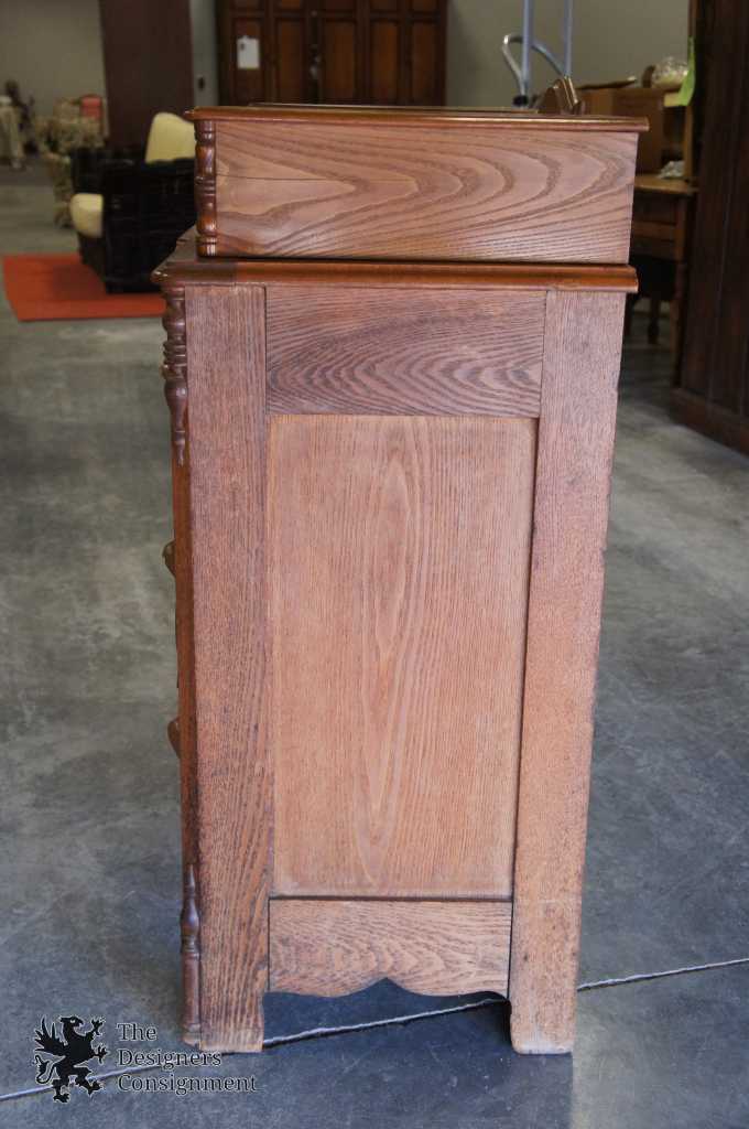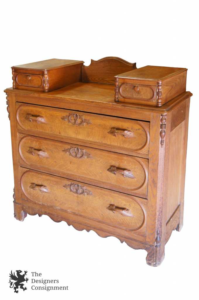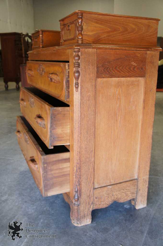Exceptional 19th century victorian dresser. Made from oak with a stepback design featuring 2 glove boxes over 4 hand dovetailed drawers. Each drawer features an ovular molding framing hand carved handles flanking an ornately designed keyhole. The corners of this chest are mounted with spindled finials adding a great dimension. Both lower and upper aprons are serpentine, framing the piece perfectly. A neat addition to any setting.