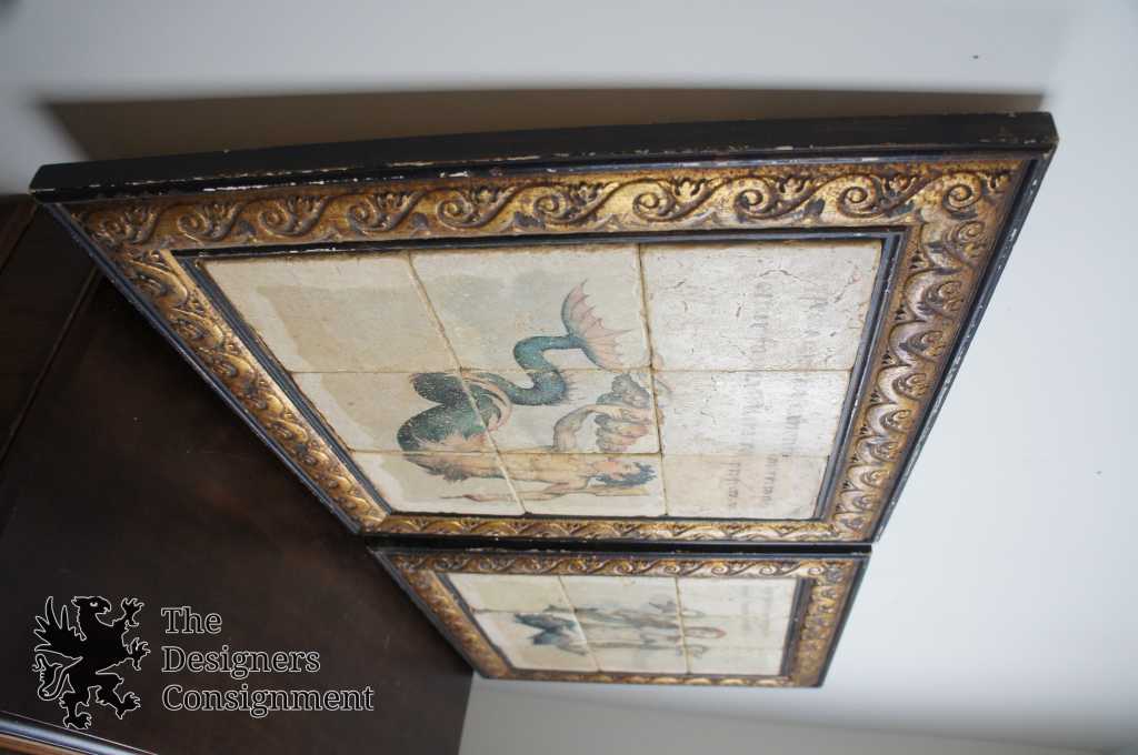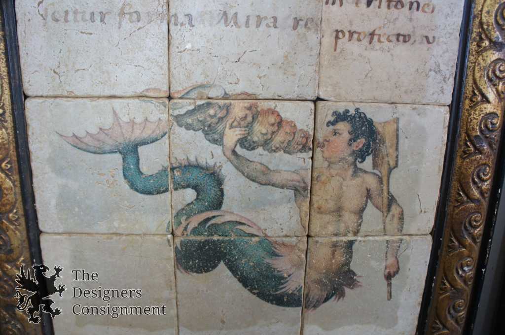 A gorgeous set of late 20th century framed Italian tiled murals. Features a mermaid and merman. Hand-painted with meticulous detail. Mounted to a wooden backing with wooden frame showing wave crest carved details. The perfect compliment to any setting.