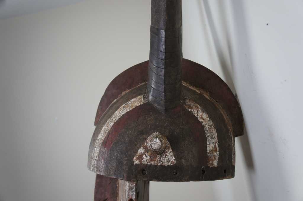Monumental tribal hardwood horned bobo mask. The perfect sculptural wall object for any setting. Meticulously crafted with a pierced Galea style helmet and leather wrapped horns. Painted in a red white and gray.