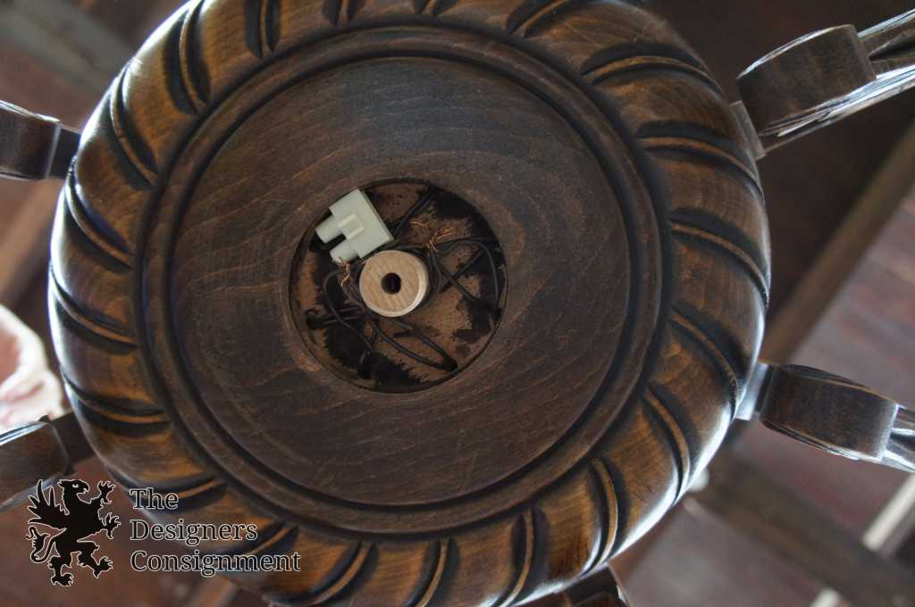 A beautifully carved 8 arm french chandelier. Floral and scalloped design with faux drip candle covers.