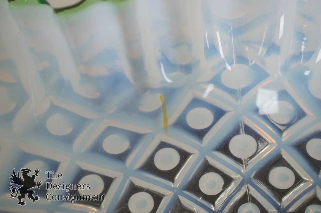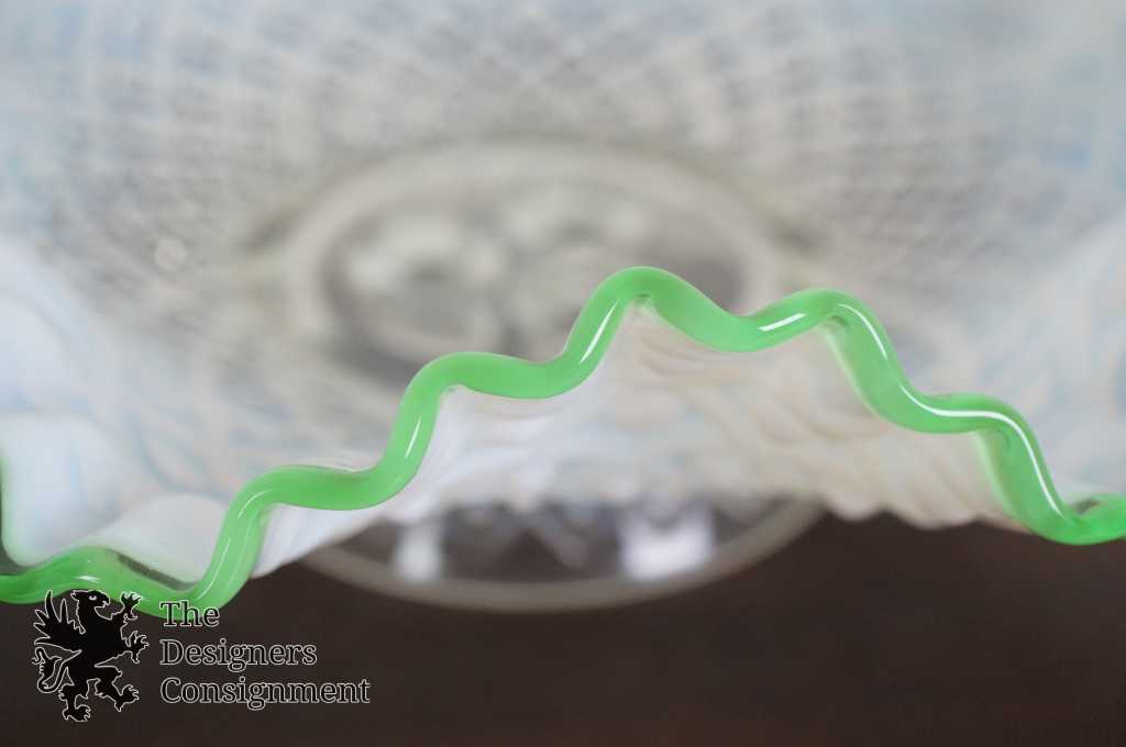 Vintage epergne made by the Fenton Glass Co. The pattern is Diamond Lace with Emerald Crest. The body is white milk glass with a diamond hobnail design. The edges are ruffled with a green crest. There are 3 openings in the bottom of the bowl for the horns to fit into.