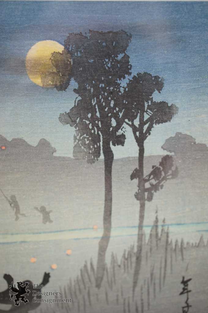 Watercolor on paper. A night setting showing silhouettes of people catching fireflies.