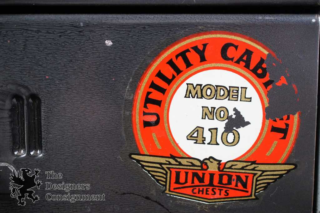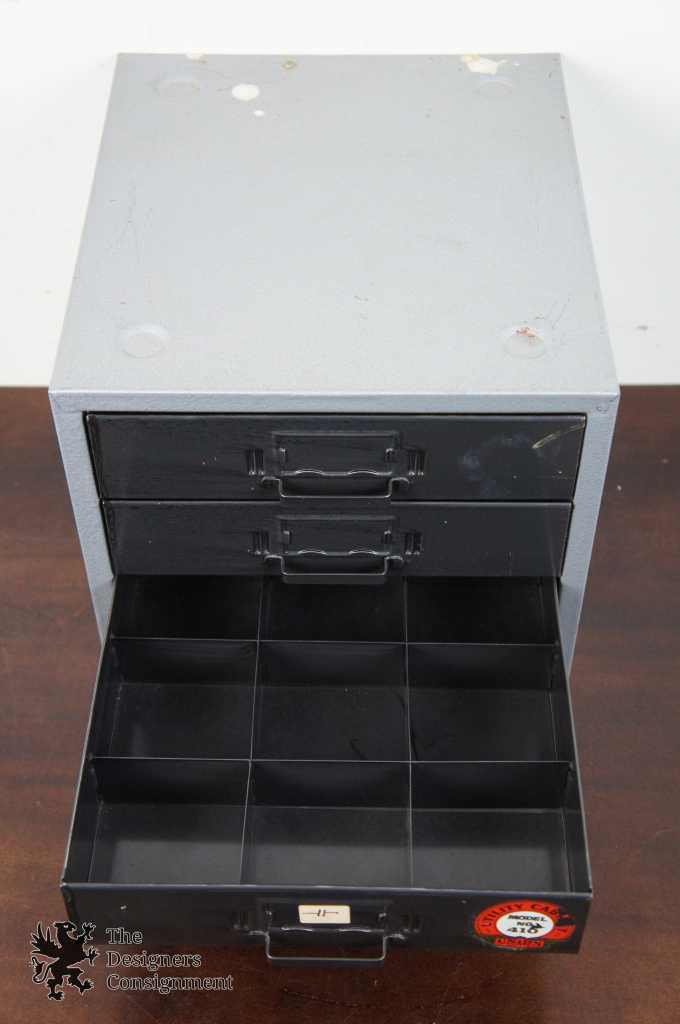 c1950s steel Union Chest Model 410; 4 drawer parts/utility cabinet. Mottled gray exterior with black drawers.