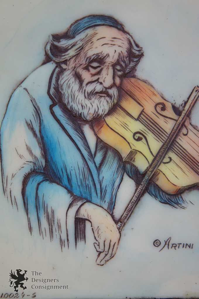 Artini hand painted sculptured engraving. Features a bearded man playing the violin.