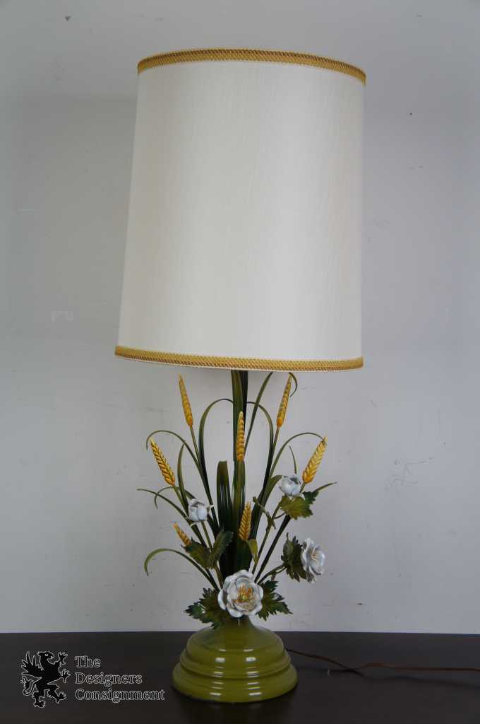 A beautiful metal tole lamp featuring flowers and a drum shade. A neat addition to any collection
