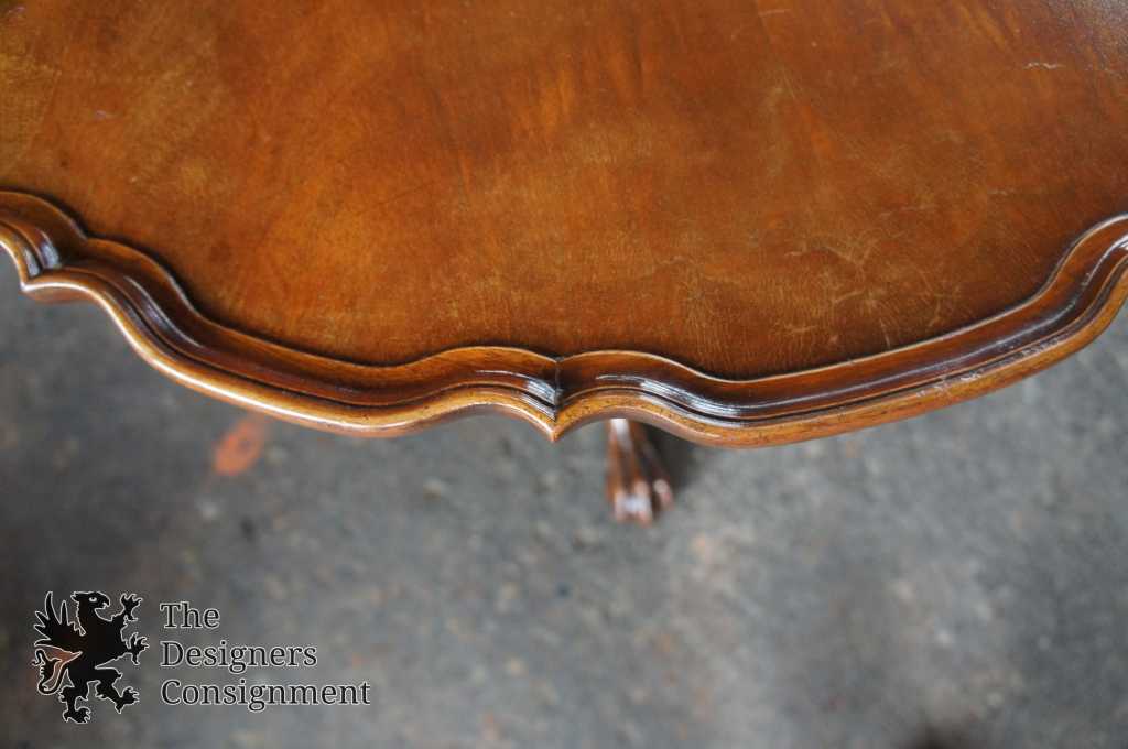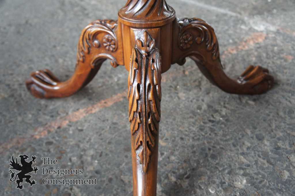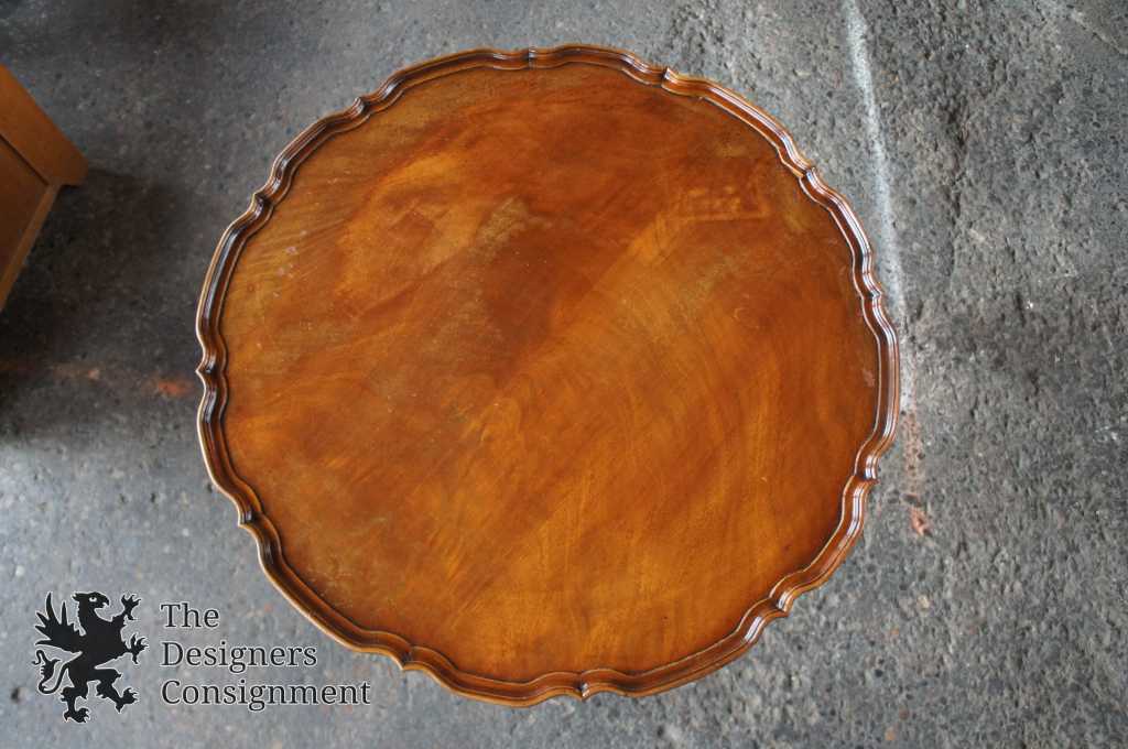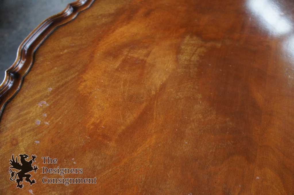This exceptional table by Imperial was made in the 1940s. At the time the company was also building airplane wings for the government. The pie crust tea table has beautiful trimming and a lovely wood grain. Made from Mahogany with a fluted center post leading to acanthus carved flourishes along the legs and ball and claw feet. The perfect compliment to any setting.