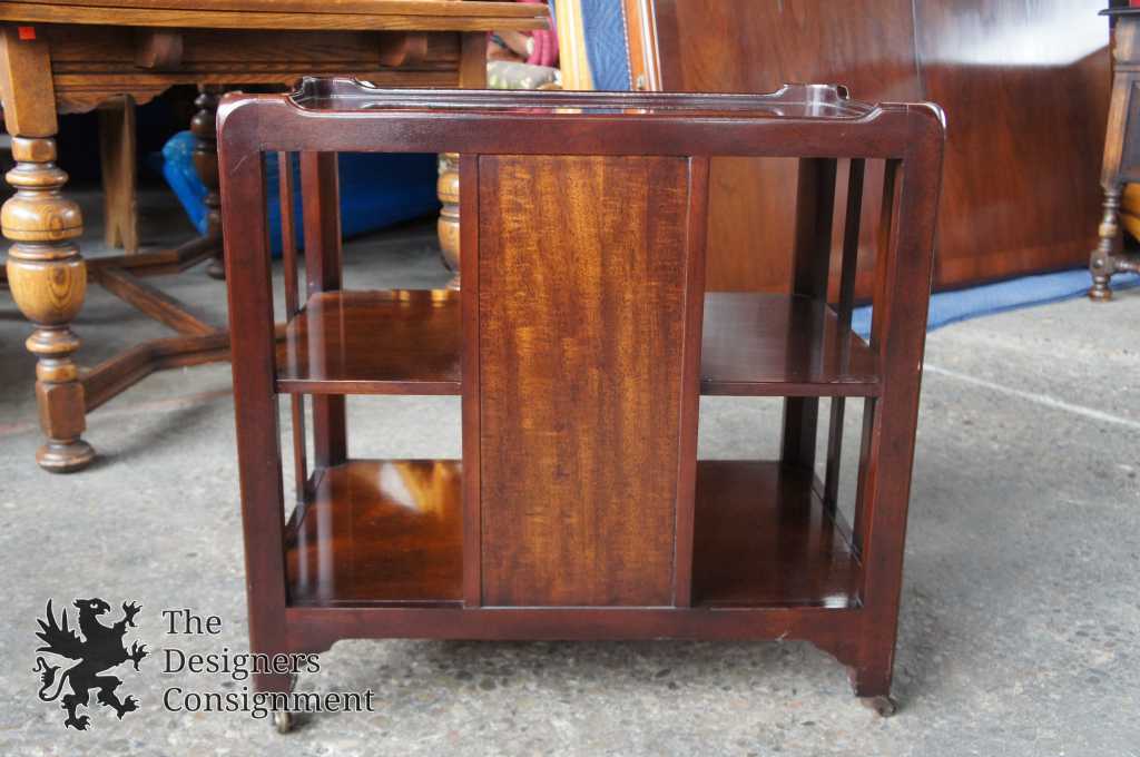 Up for consideration is a gorgeous tiered etagere end table with cabinet. Made from Mahogany with chippendale hardware and tassel along the front. An open design along the sides makes it neat for use as a bookcase or ornamental display. Features an inset top and castors along the bottom for ease of movement.