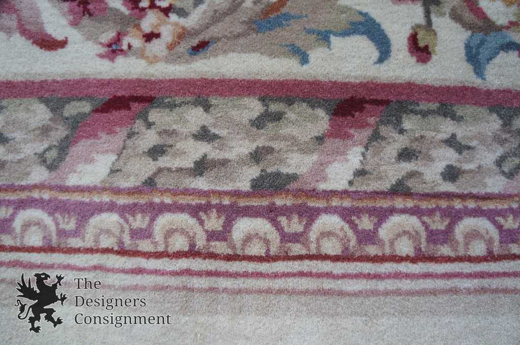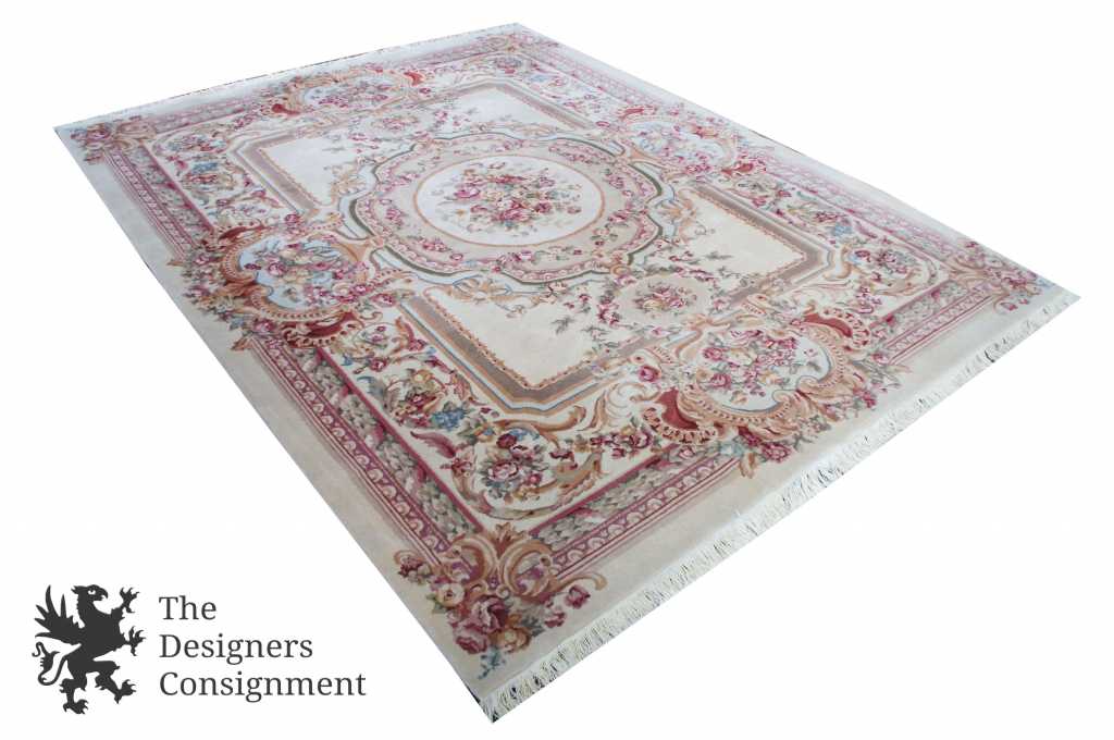 Aubusson is a town in Creuse River France. Aubusson rugs made in tapestry technique are among the most elegant and luxurious floor coverings. This beautiful 8' x 10' handmade area rug is in baroque styling with beautiful flowers and vibrant coloring. Made from Wool. Approximately 200 knots per square inch.