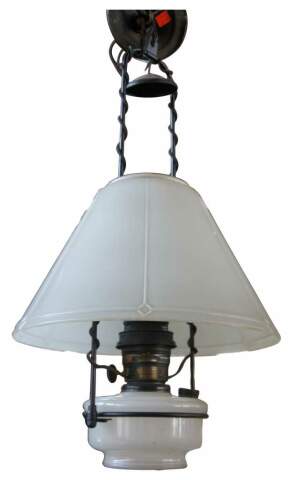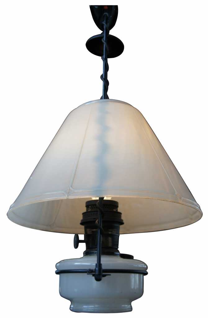 Early 20th century converted hanging lantern by Aladdin. Features a cast iron support which holds the large white glass shade and kerosene lantern. Marked along the switch, converted for electric.