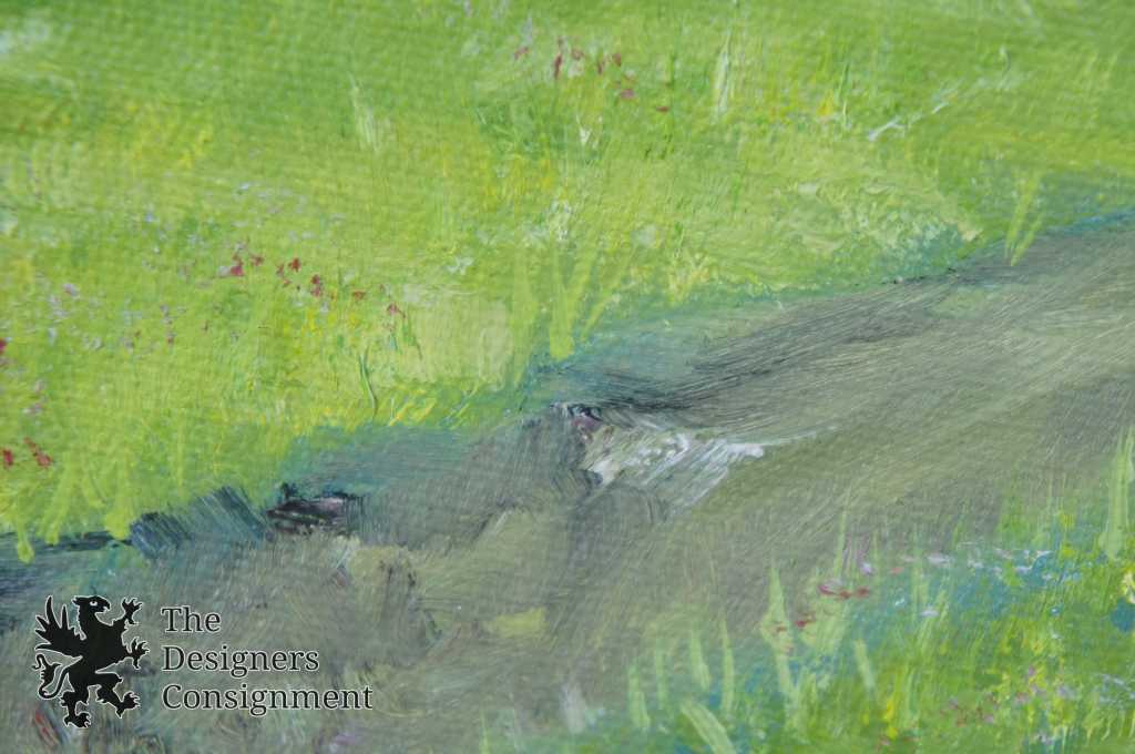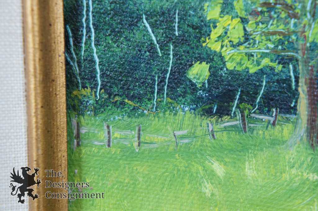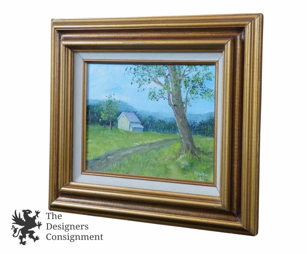 A vivid oil painting showing a farm landscape. Canvas Signed Newell lower right. Includes a wooden frame with gold trim.