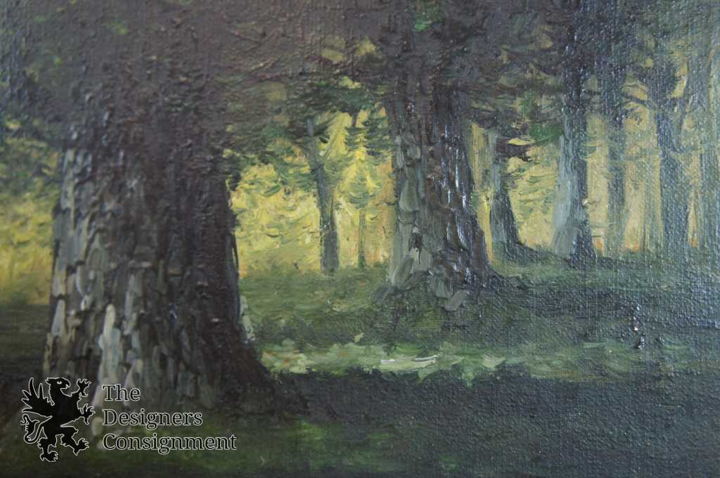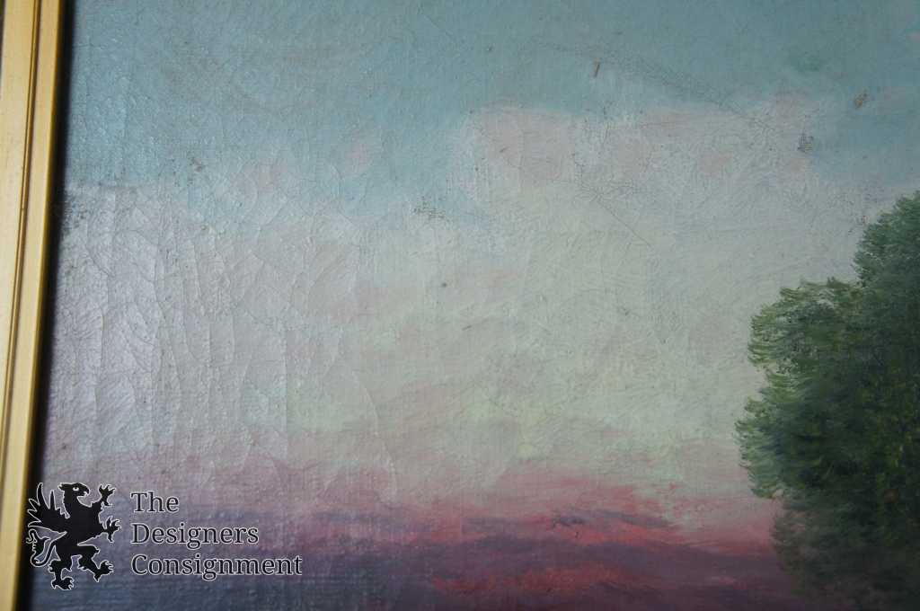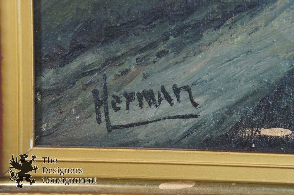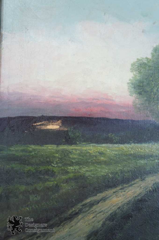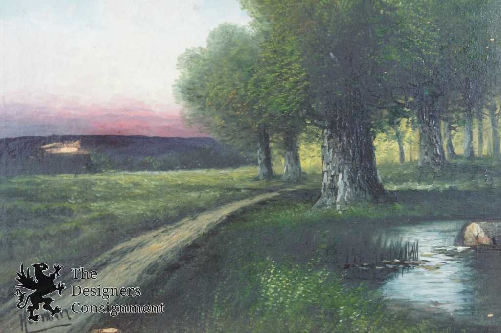 A gorgeous antique oil painting. A dawn countryside setting with a pond, trees and trail. Signed Herman lower right. The painting is on canvas with a baroque inspired frame. A neat addition to any setting