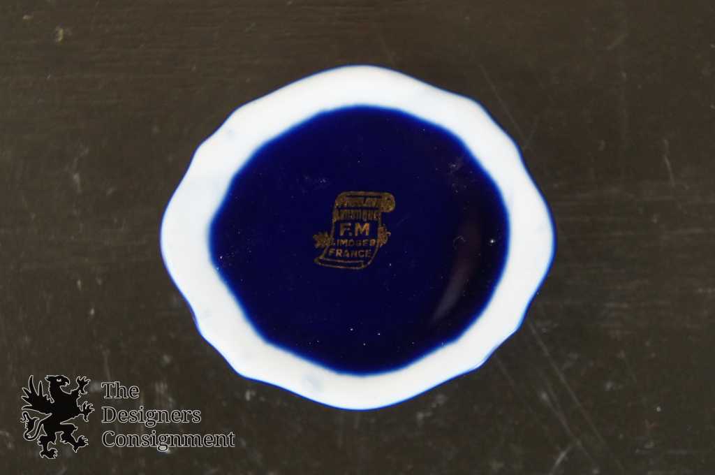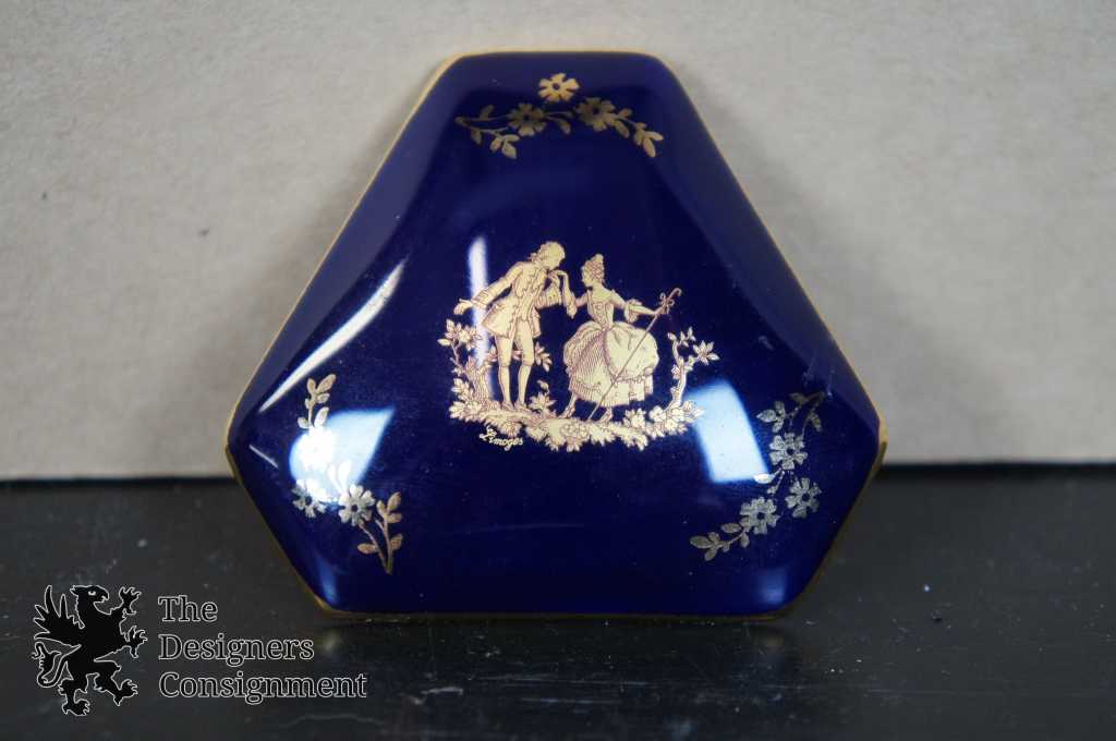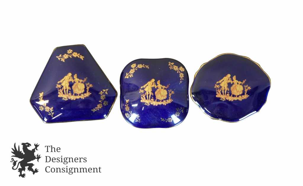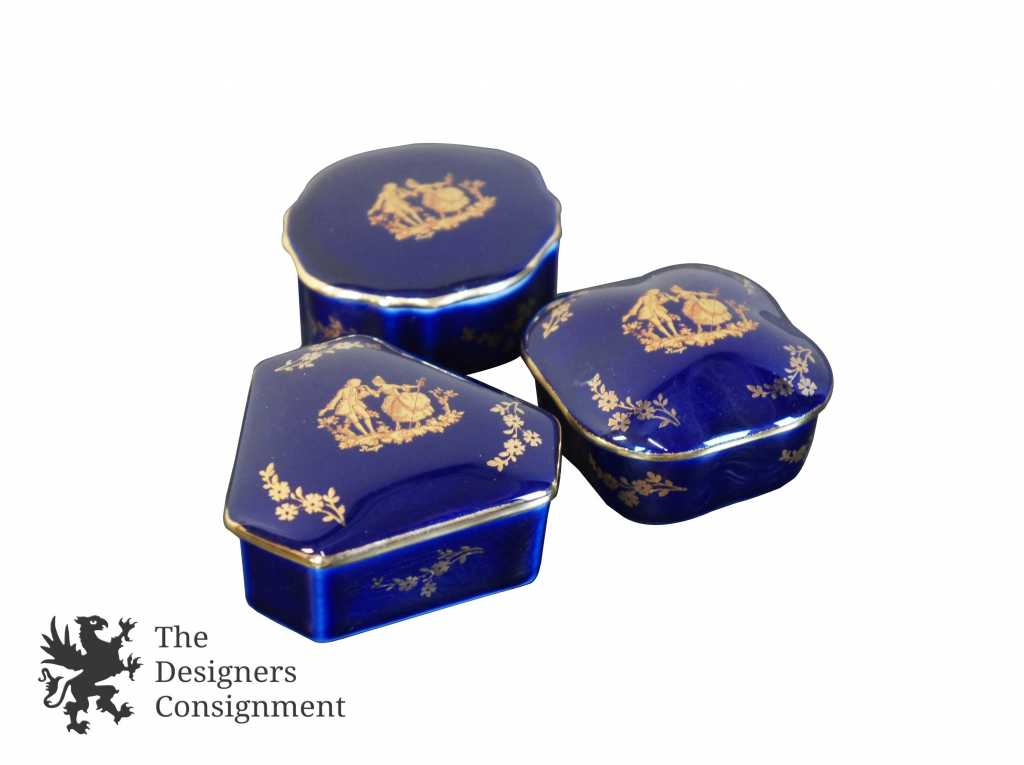 F.M. Limoges Lidded Trinket Boxes. Cobalt blue with gold trim. Features a classical scene along the lid