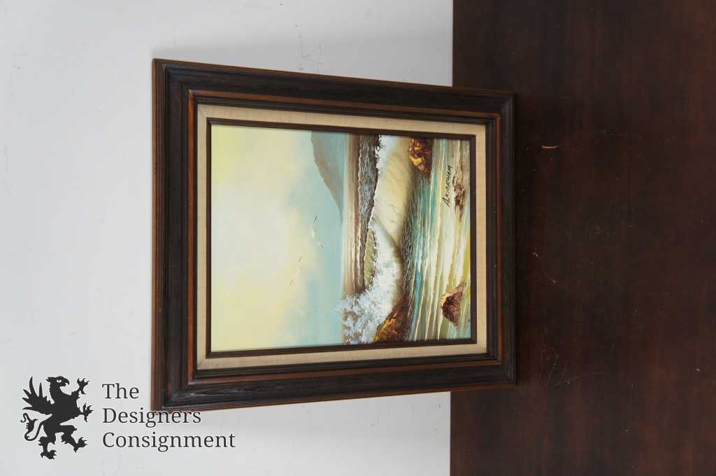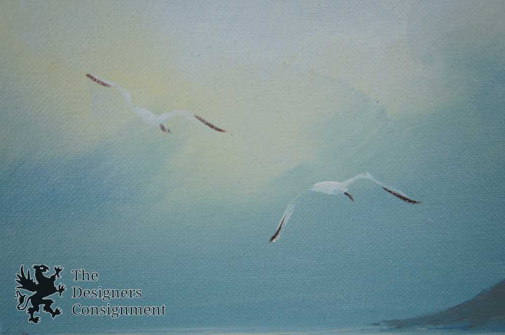 Original Oil Painting On Canvas. Signed A. Kirkham. Depicts waves crashing along the shore. Seagulls can be seen flying above and a mountain in the background. Signed lower right.