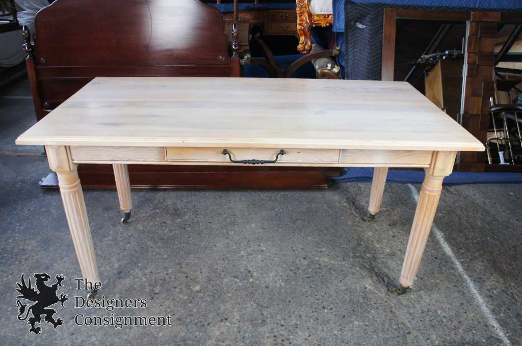 Neoclassical style desk in white washed pine. Fluted legs with brass casters