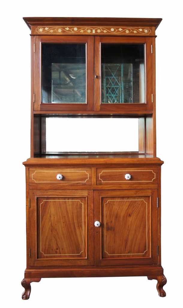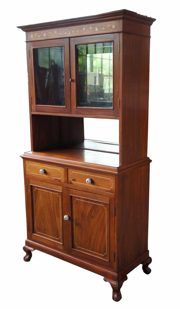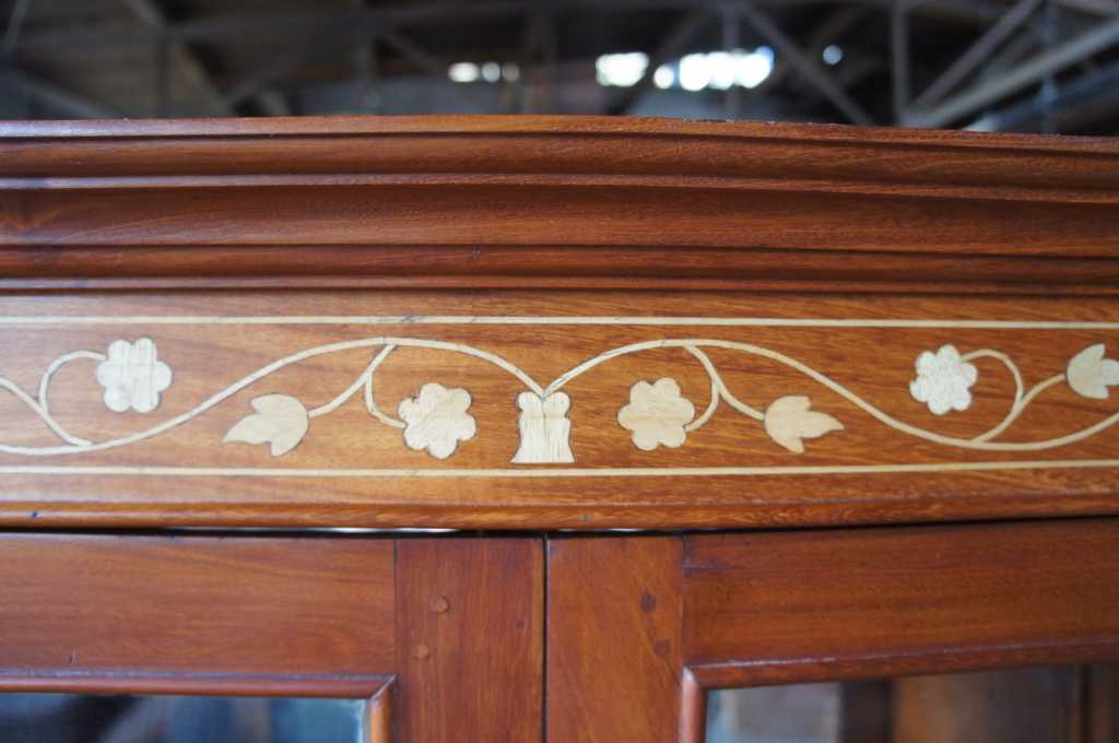 Antique European China Hutch, circa first half 20th century. Made from mahogany with mirrored backing marquetry and porcelain knobs. Lower cabinet rests on ball and claw feet. Upper molding is inlaid with satinwood. A great service piece for any setting.