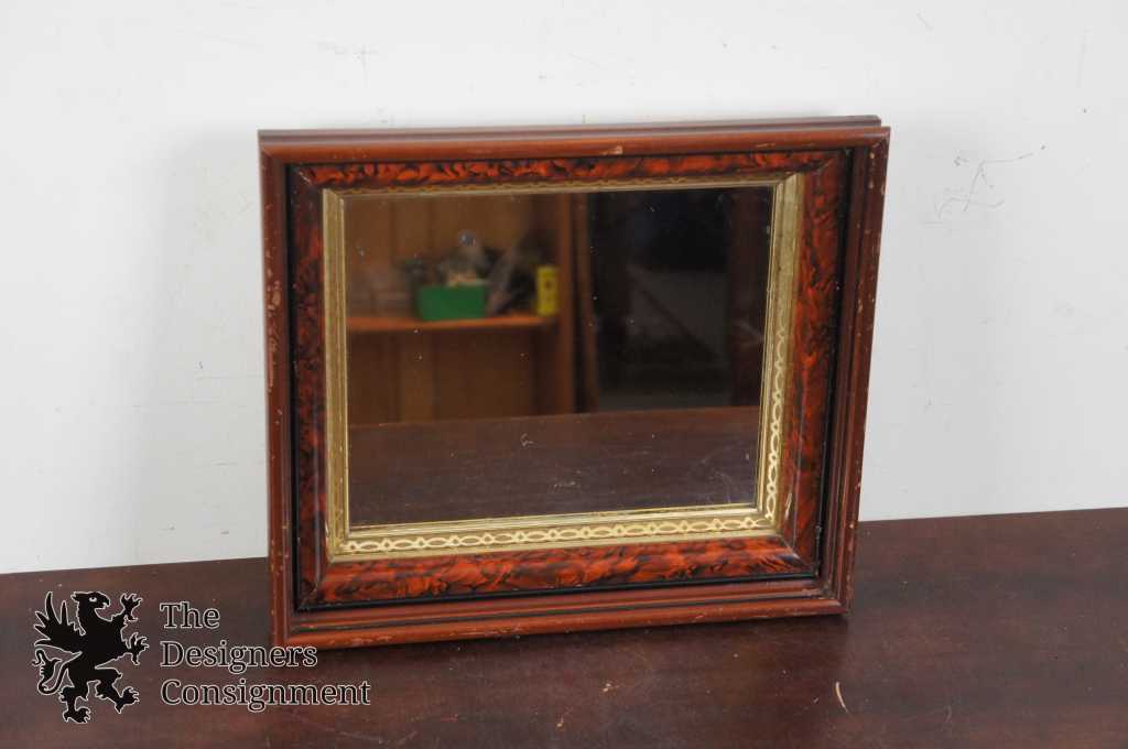 Early 20th century wall hanging mirror. Made from wood with a 3 tiered frame. The innermost is trimmed in gold with a fretwork pattern. Mounted outside of that is a painted wood grain that is mounted to outermost frame of walnut. A neat piece that will make a great addition to any setting.