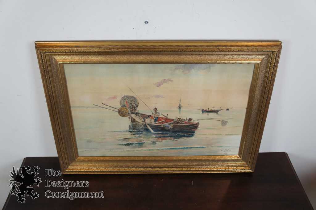 An exquisite watercolor by Olleroy Blas, signed lower right. Depicts a fishing boat out in the ocean. 2 men can be seen on board with reels, nets and other tools. Vivid color and detail. Features a victorian frame with gold finish.