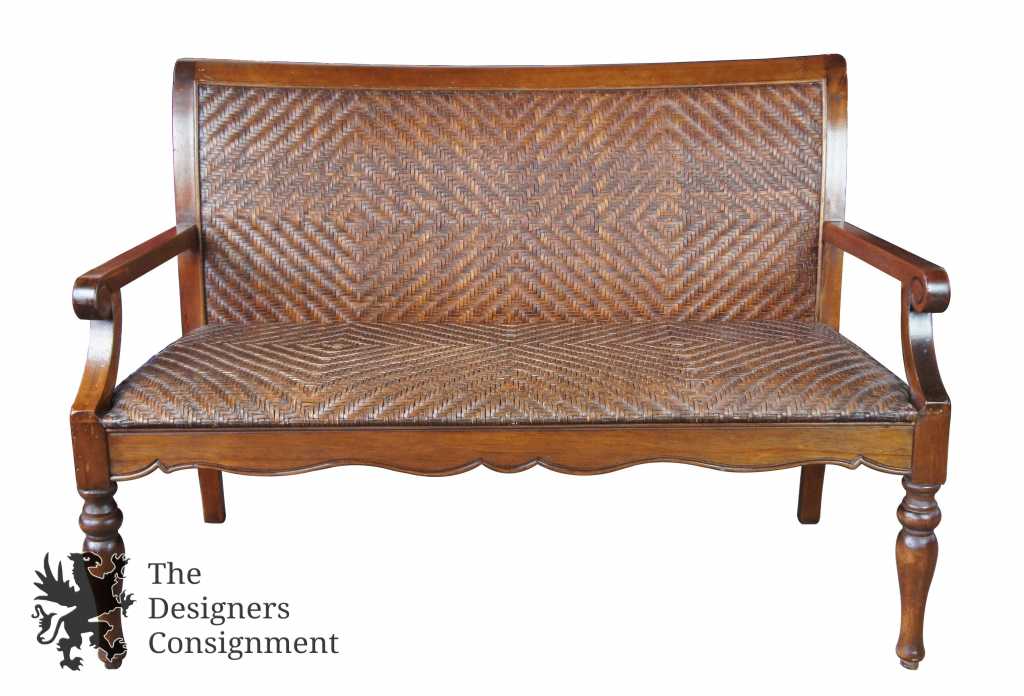 Traditional bench by Harden Furniture. Made from mahogany with a woven rattan seat. A very durable piece that works well in any setting. Naturally distressed with scrolled arms and a serpentine front apron. Marked harden along a stretcher beneath the seat.