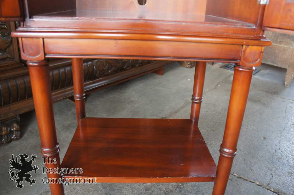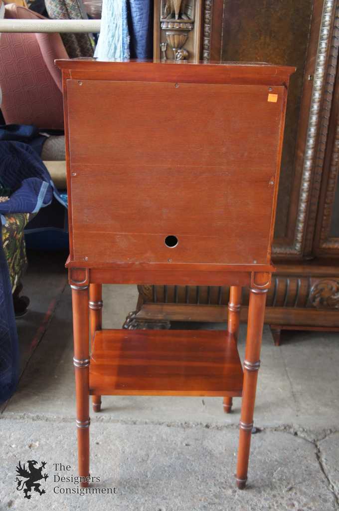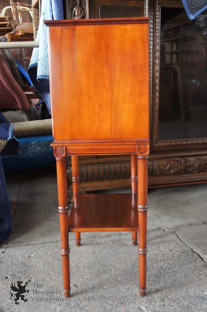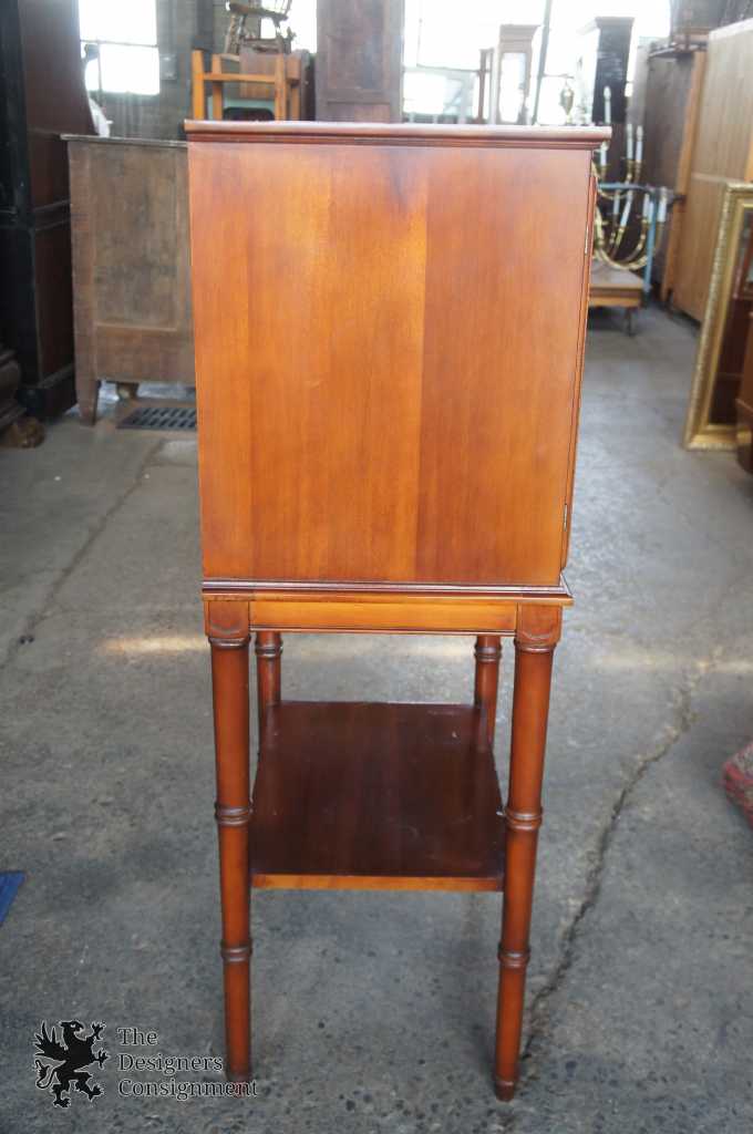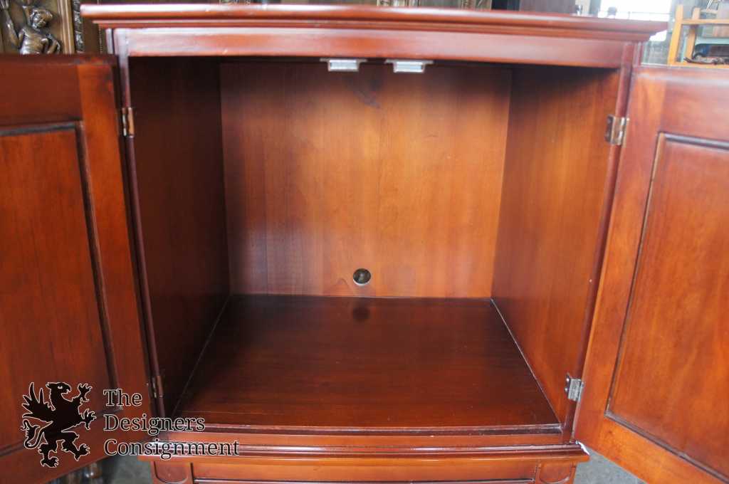 Ethan Allen 2 door cabinet. 45-6507, purchased in 2002. Made from Mahogany with long campaign style legs and lower shelf. Upper portion has 2 doors that open to a clean interior. Hole punched in the back allows for use as a media cabinet.
