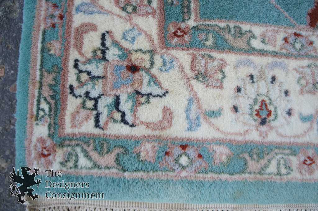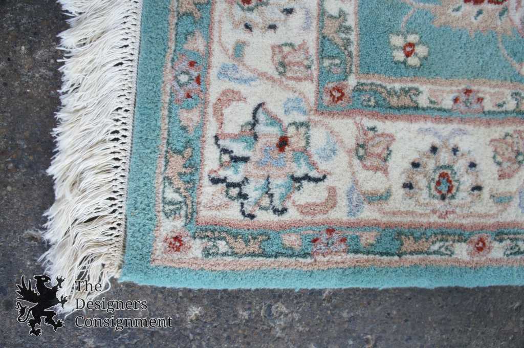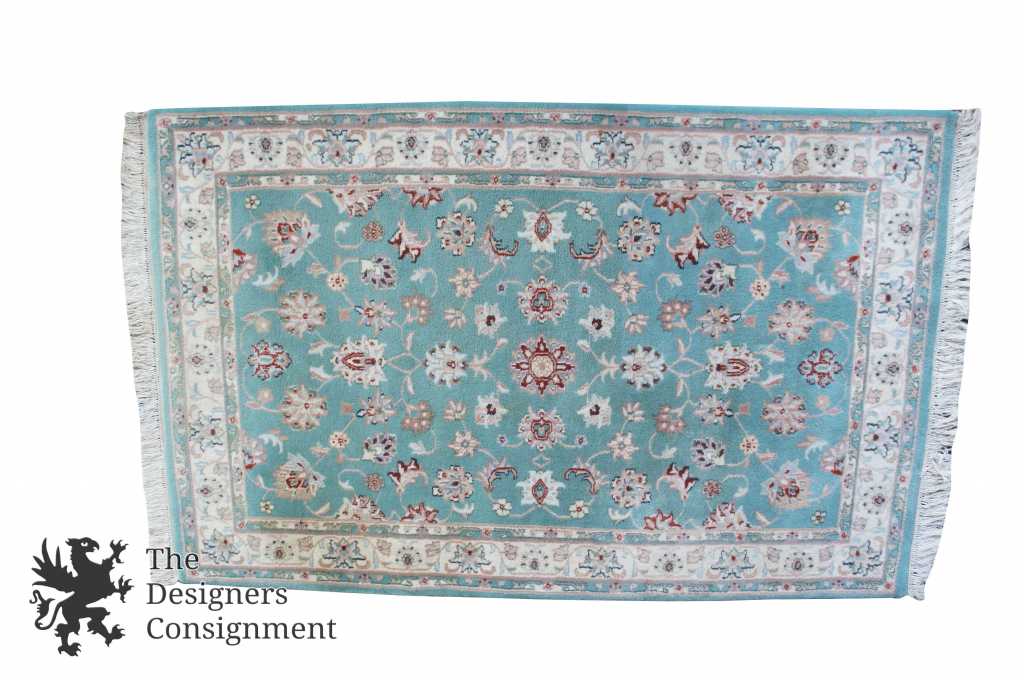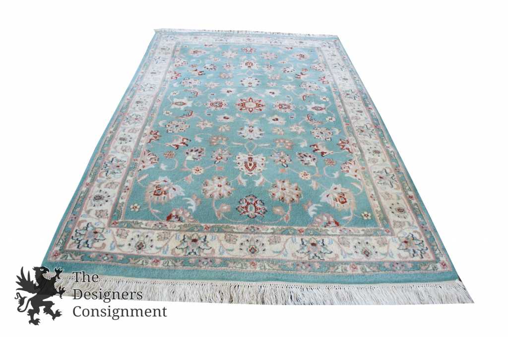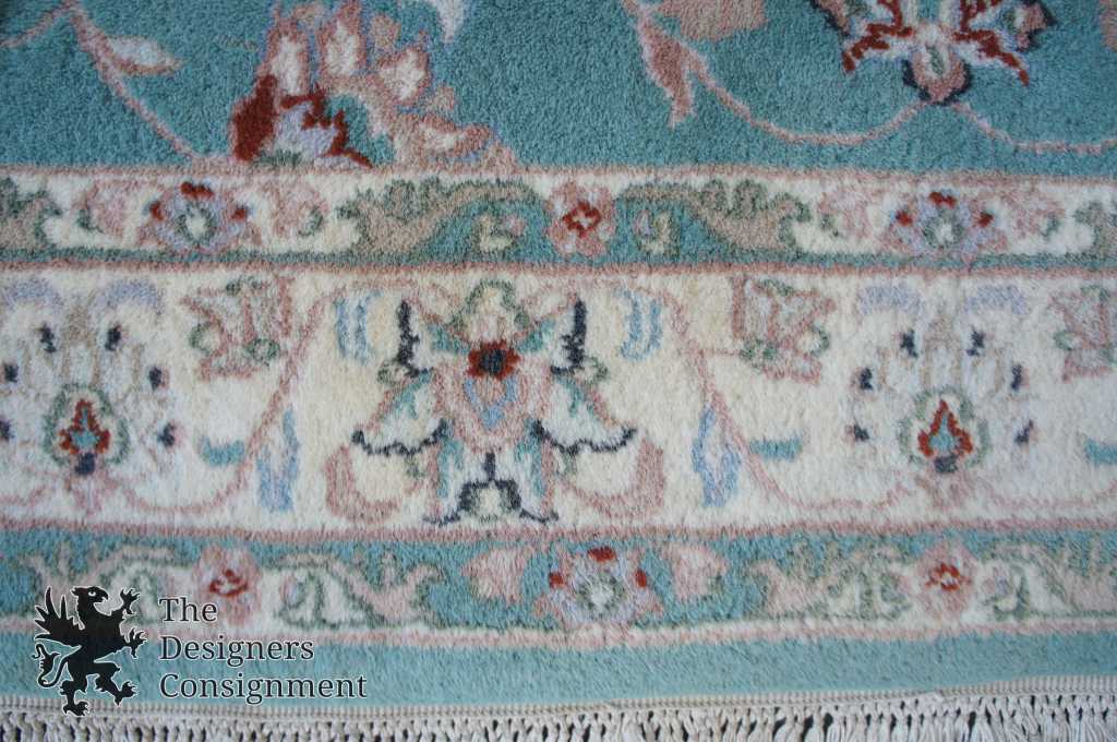 Kashan rugs are a type of Persian rug. They are one of the most expensive types of rug woven in Iran. This beautiful turquoise rug has a floral all over pattern. a vibrant addition to any space.