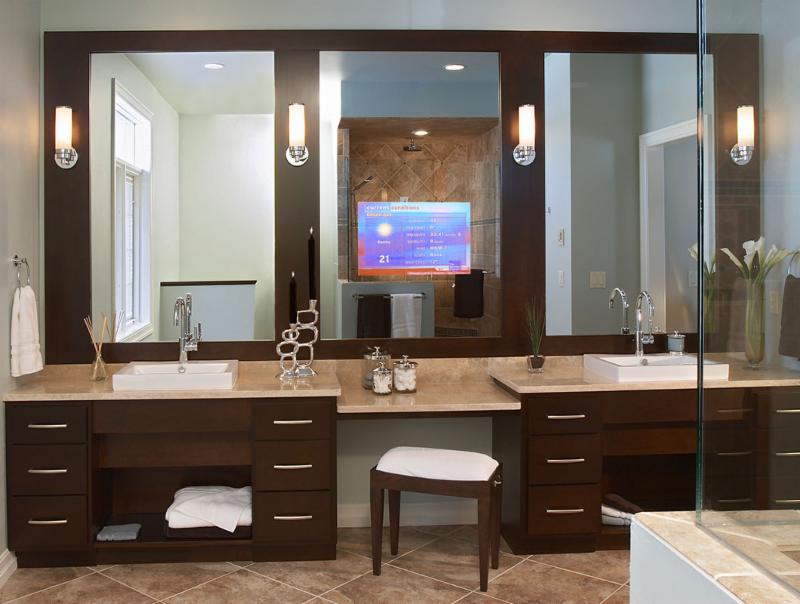 Custom made bathroom/ wall mirror with vanishing tv by Seura. The tv is a 19" Lcd featuring inputs for hdmi, component, and standard audio and video. A sleek design allows this piece to streamline to any wall. A fun addition to any space.