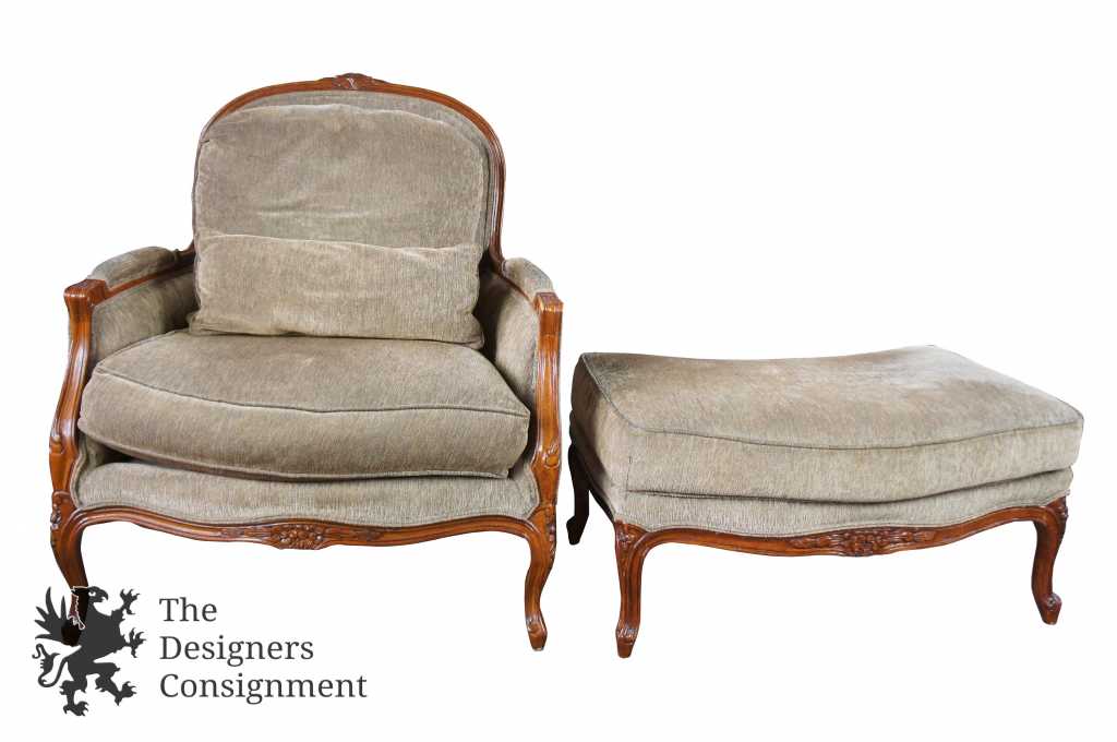 Louis XV Bergere Style Chair and ottoman by Henredon. Part of their upholstery collection. Neatly designed with a distressed frame featuring floral carvings. Upholstered in a grayish beige fabric.