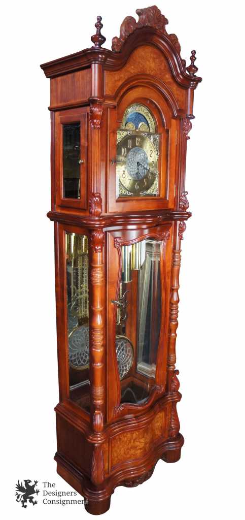 Dial is framed by carved and reeded posts and pendulum door is framed by curved capitals and turned posts
