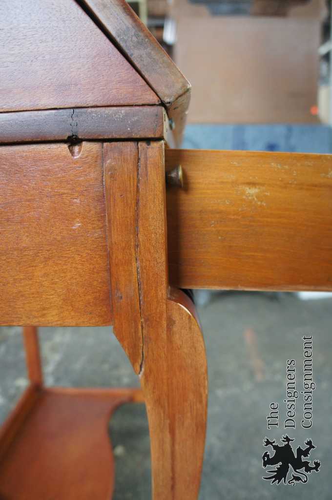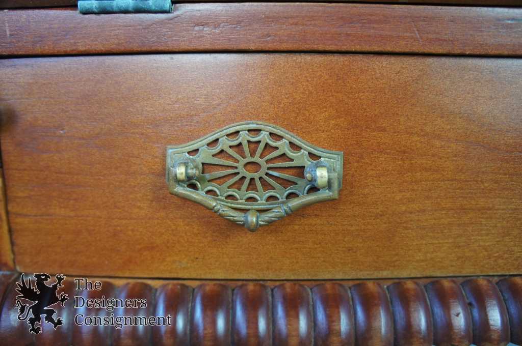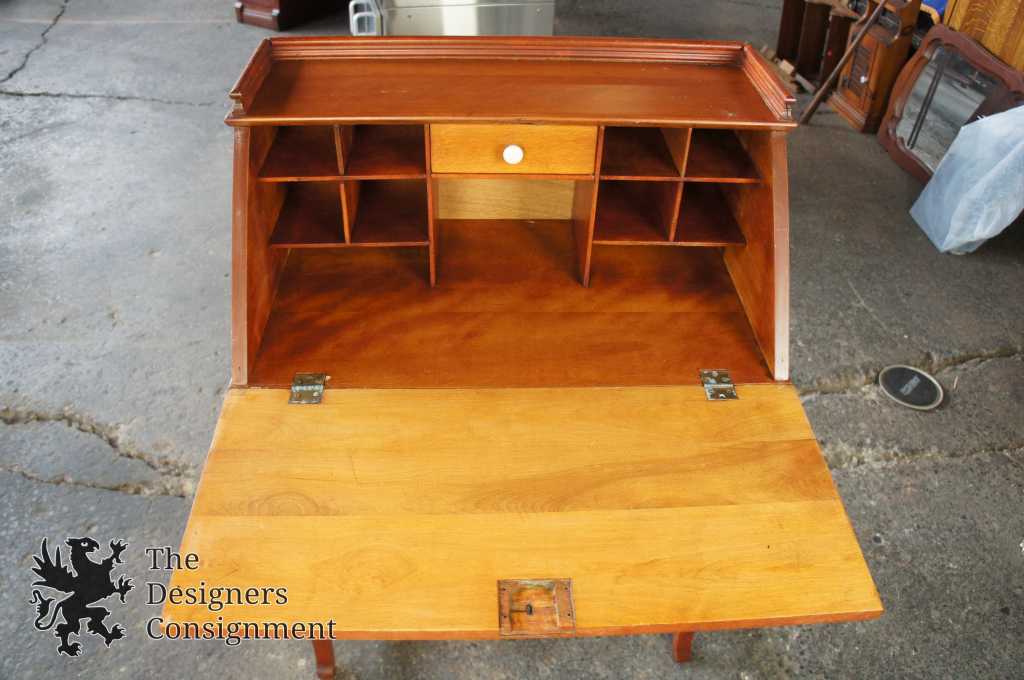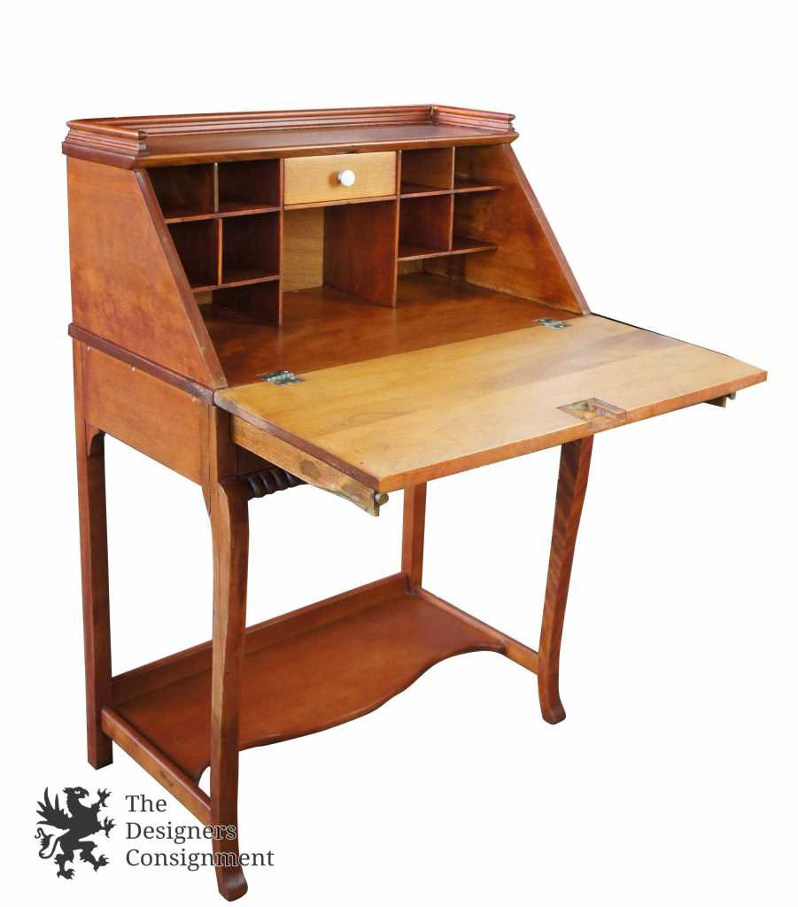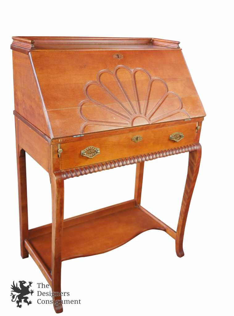 Early 20th century maple secretary desk. Features a scalloped front lid and lower drawer with brass hardware. Lower apron shows carved gadrooning. Secretary opens to pigeon holes and drawer with porcelain knob. A great compliment to any setting